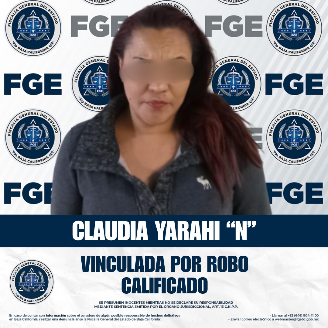 ENSENADA, BAJA CALIFORNIA. - La Fiscalía Regional de Ensenada, a través de la Unidad de Investigación de Delitos con Detenido, logró la vinculación a proceso de Claudia Yarahi “N”, por el delito de robo calificado cometido en un establecimiento comercial abierto al público.