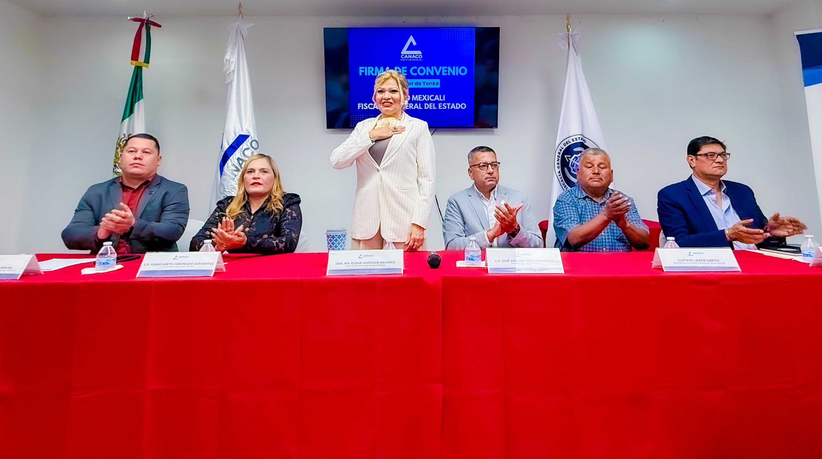 MEXICALI, BAJA CALIFORNIA. - Con la finalidad de reforzar la coordinación institucional y prevenir el robo de vehículos, la Fiscal General del Estado, Dra. Ma. Elena Andrade Ramírez, firmó un convenio de colaboración con representantes de yonkes afiliados a CANACO Mexicali, encabezados por su presidente, José Antonio Villa González.