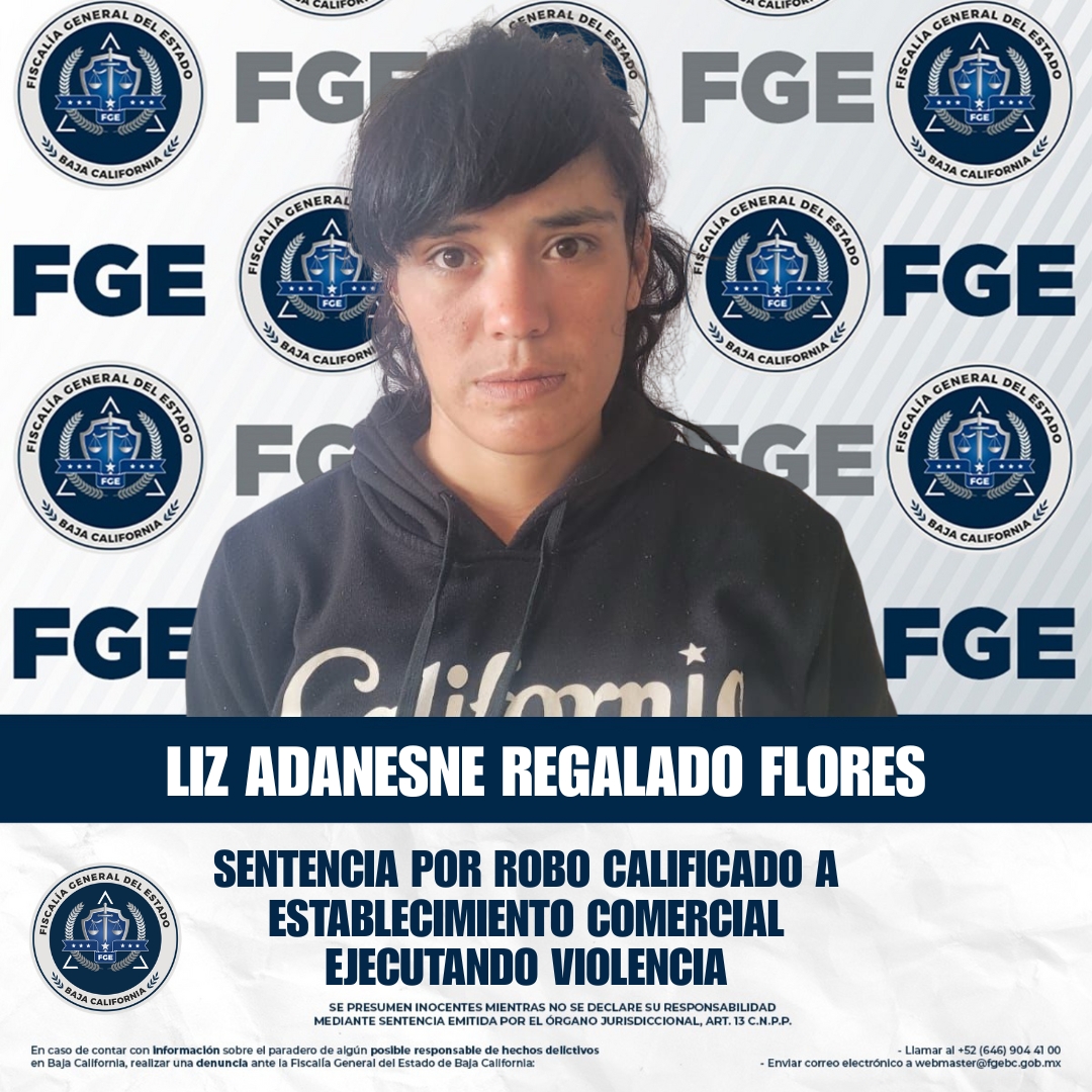 ENSENADA, BAJA CALIFORNIA. - La Fiscalía Regional de Ensenada, a través de la Unidad de Investigación de Delitos de Robo, logró que se dictara sentencia condenatoria contra Liz Adanesne Regalado Flores por el delito de robo con violencia en establecimiento comercial.