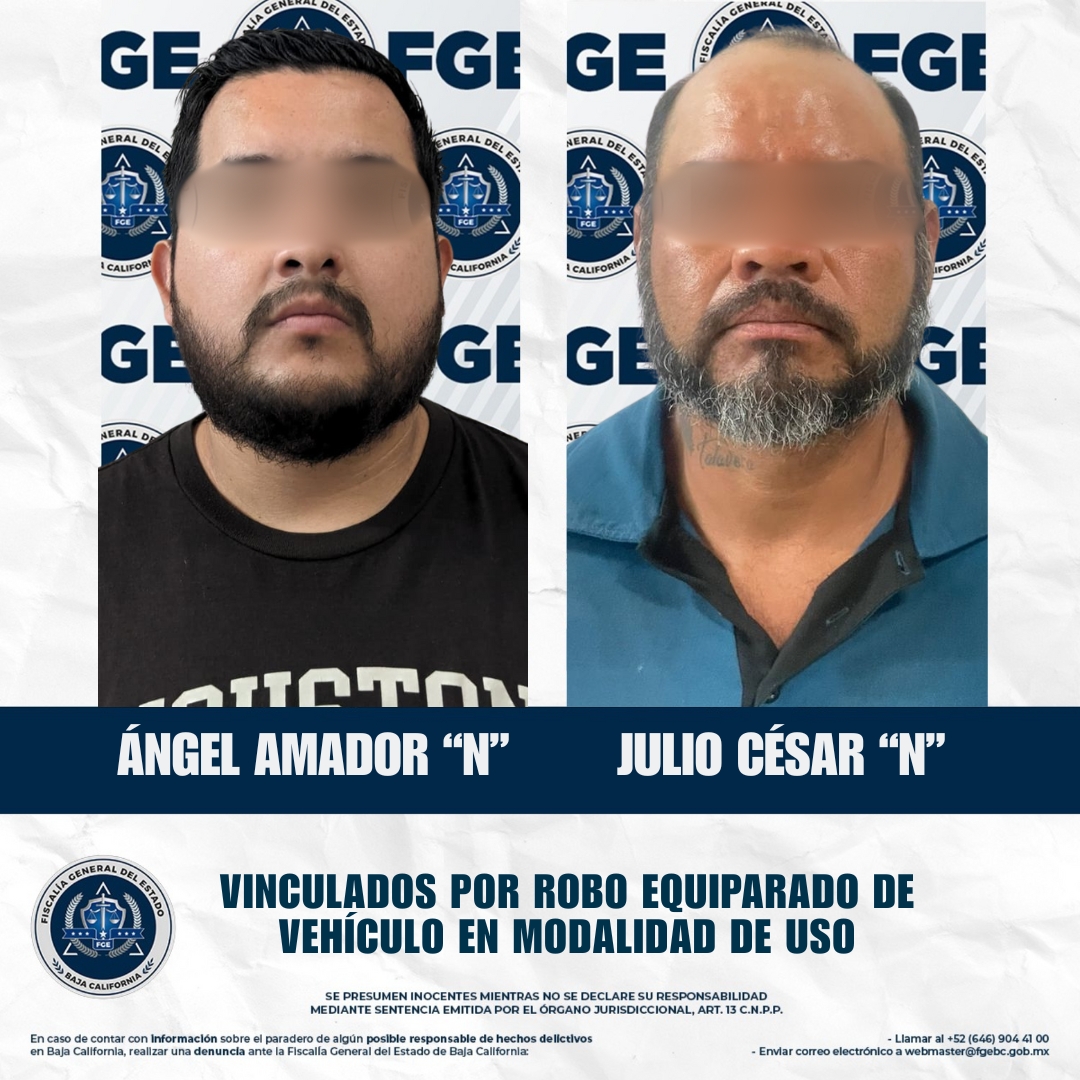 ENSENADA, BAJA CALIFORNIA. - La Fiscalía Regional de Ensenada, en coordinación con la Unidad de Investigación de Robo de Vehículos, logró la vinculación a proceso de Ángel Amador “N” y Julio César “N” por los delitos de robo equiparado de vehículo en su modalidad de uso y posesión de vehículo de motor robado.