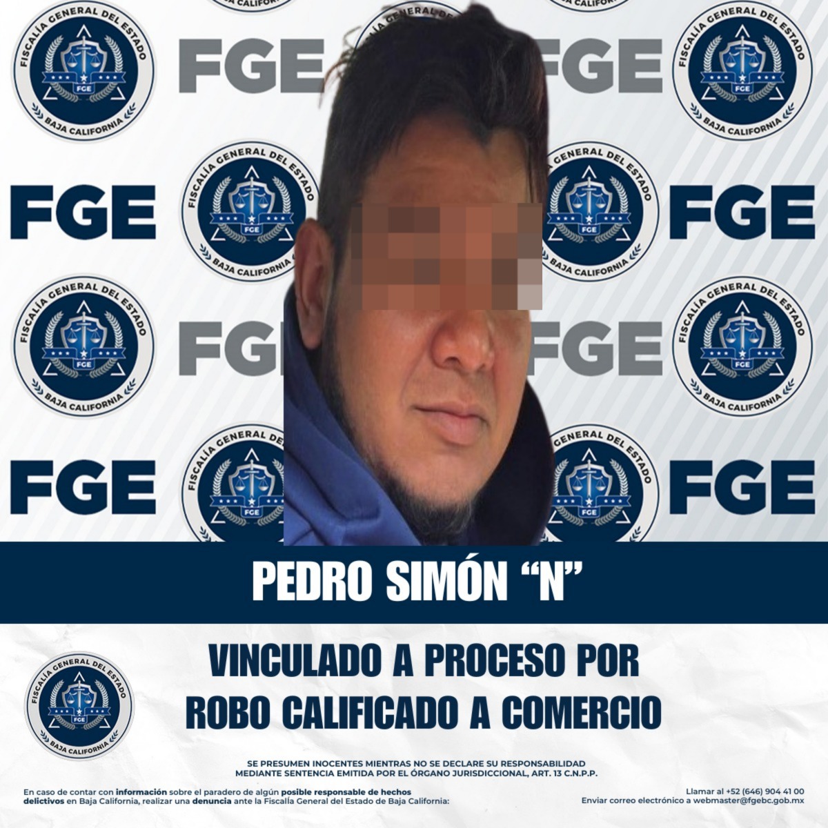 TIJUANA, BAJA CALIFORNIA. - La Fiscalía General del Estado, a través de la Fiscalía Regional de Tijuana, obtuvo la vinculación a proceso de Pedro Simón “N”, por su probable participación en el delito de robo calificado a comercio abierto al público.
