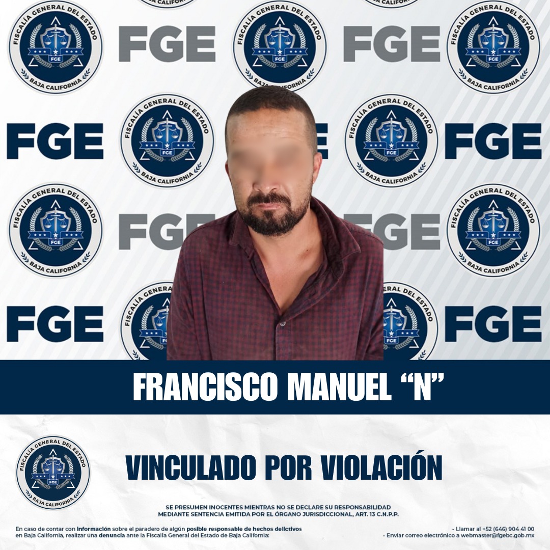 ENSENADA, BAJA CALIFORNIA. - La Fiscalía Regional de Ensenada informa que se obtuvo auto de vinculación a proceso en contra de Francisco Manuel “N”, de 43 años de edad, por su probable responsabilidad en el delito de violación, en agravio de una mujer.