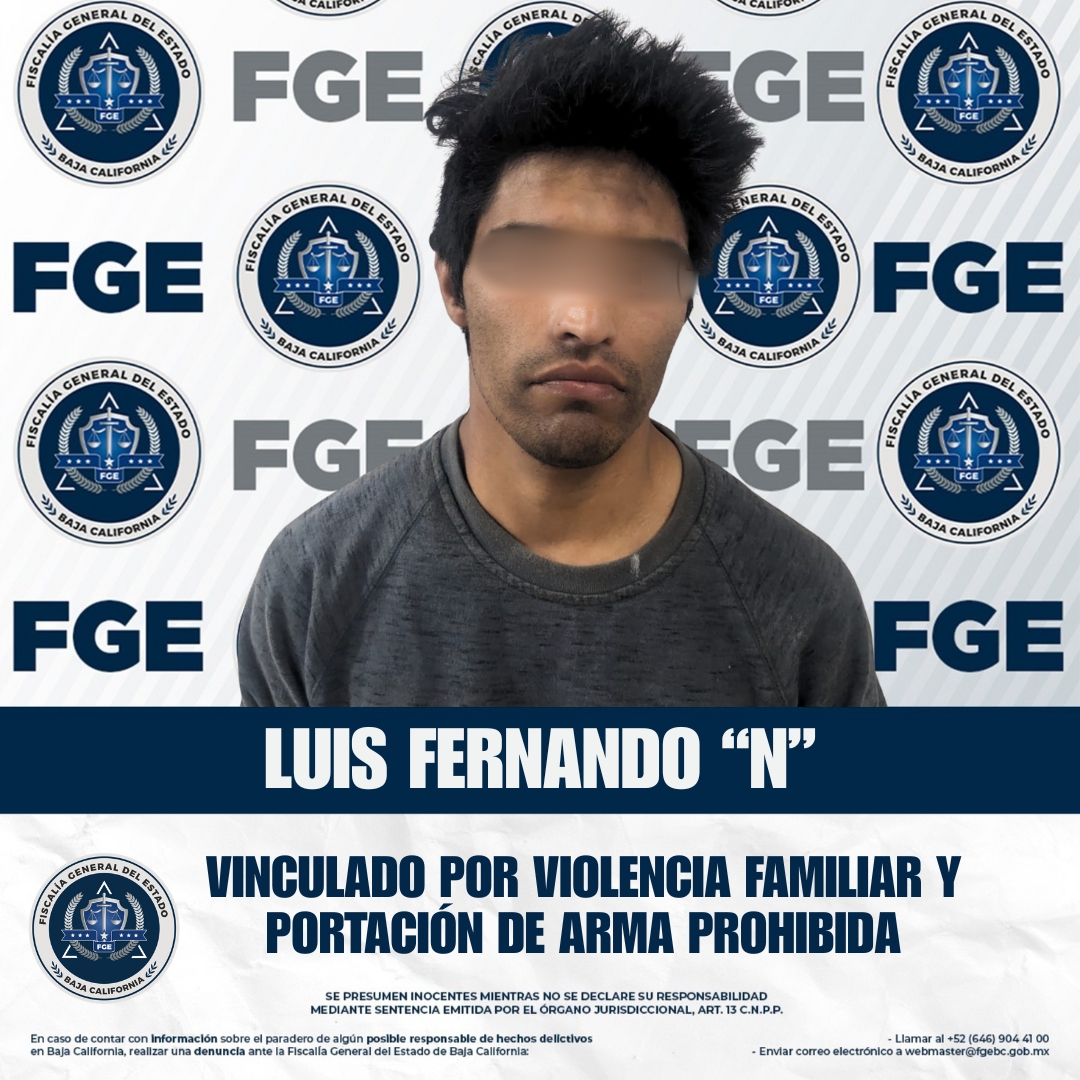 ENSENADA, BAJA CALIFORNIA. - La Fiscalía Regional de Ensenada, en coordinación con la Unidad de Investigación con Detenido, logró la vinculación a proceso de Luis Fernando “N”, por los delitos de violencia familiar y portación de arma prohibida, tras un hecho ocurrido en la colonia Bellavista.