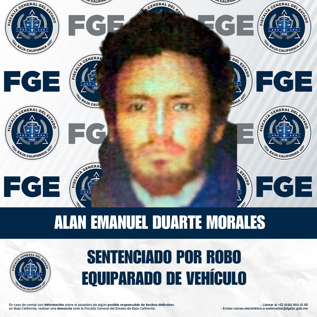 TIJUANA, BAJA CALIFORNIA. - La Fiscalía Regional de Tijuana, a través de la Unidad de Investigación de Robo de Vehículos, Zona Tijuana, informa que se logró obtener una sentencia condenatoria en contra de Alan Emanuel Duarte Morales por el delito de robo equiparado de vehículo de motor, en la modalidad de uso de vehículo robado.