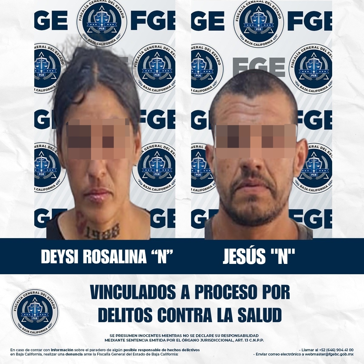 TIJUANA, BAJA CALIFORNIA. - La Fiscalía General del Estado, a través de la Fiscalía Especializada en Narcomenudeo, obtuvo la vinculación a proceso de Deysi Rosalina “N” y Jesús “N”, por su presunta responsabilidad en delitos contra la salud en su modalidad de narcomenudeo, específicamente por posesión simple del psicotrópico denominado metanfetamina.