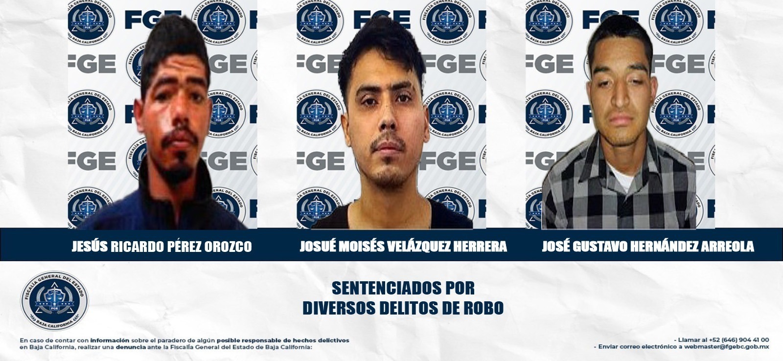 MEXICALI, BAJA CALIFORNIA. - La Fiscalía Regional de Mexicali, a través de la Unidad de Investigación de Delitos con Detenidos Poniente y Robos Oriente, obtuvo la sentencia condenatoria de tres individuos del sexo masculino, los cuales fueron declarados culpables de los delitos de robo con violencia y robo calificado cometido en establecimiento comercial abierto al público con violencia.