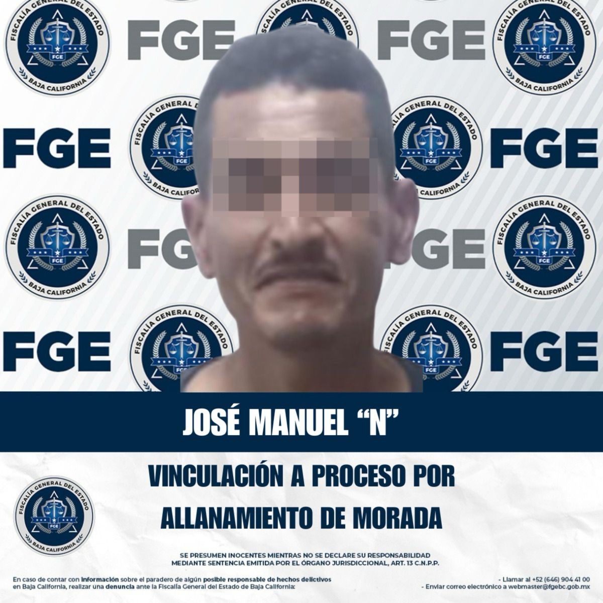 TIJUANA, BAJA CALIFORNIA. - La Fiscalía Regional de Tijuana, a través de la Unidad de Investigación con Detenido, obtuvo la vinculación a proceso de José Manuel “N”, por el delito de allanamiento de morada, derivado de hechos ocurridos el pasado 14 de julio del presente año.