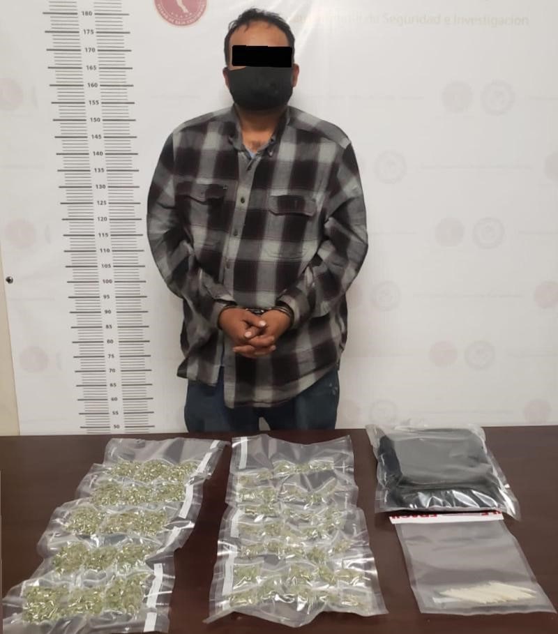 Al momento, se procedió a realizar la revisión precautoria, encontrándole entre sus pertenencias 50 bolsas transparentes de marihuana y 10 cigarrillos de la misma sustancia. El detenido y la droga quedaron a disposición de la autoridad correspondiente, quien determinara su situación jurídica.
