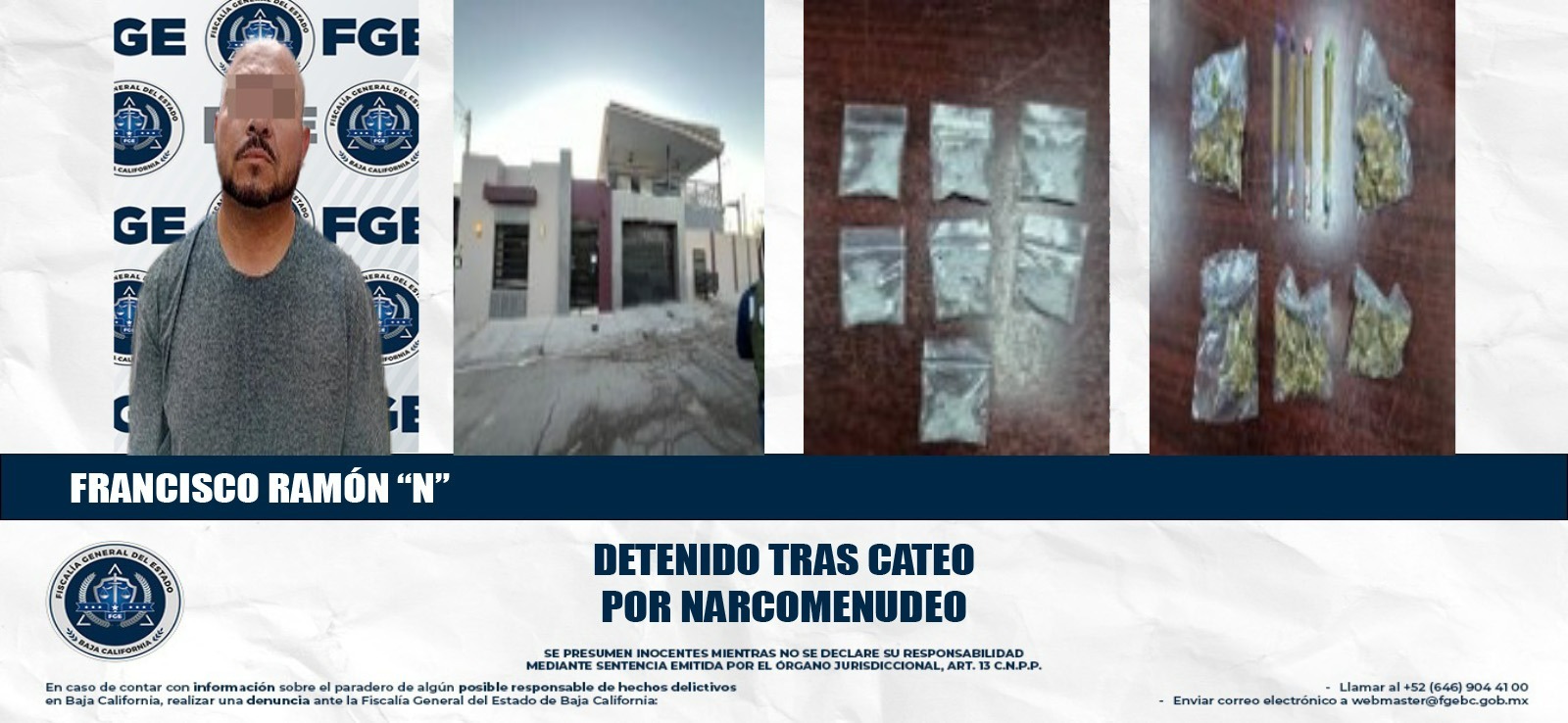 MEXICALI, BAJA CALIFORNIA. - Como parte de las acciones para combatir el narcomenudeo y desarticular puntos de venta de droga conocidos como “Tienditas”, la Fiscalía General del Estado (FGE) ejecutó un cateo en un domicilio ubicado en el fraccionamiento El Dorado, logrando el aseguramiento de diversas sustancias ilícitas y la detención de un presunto narcomenudista.