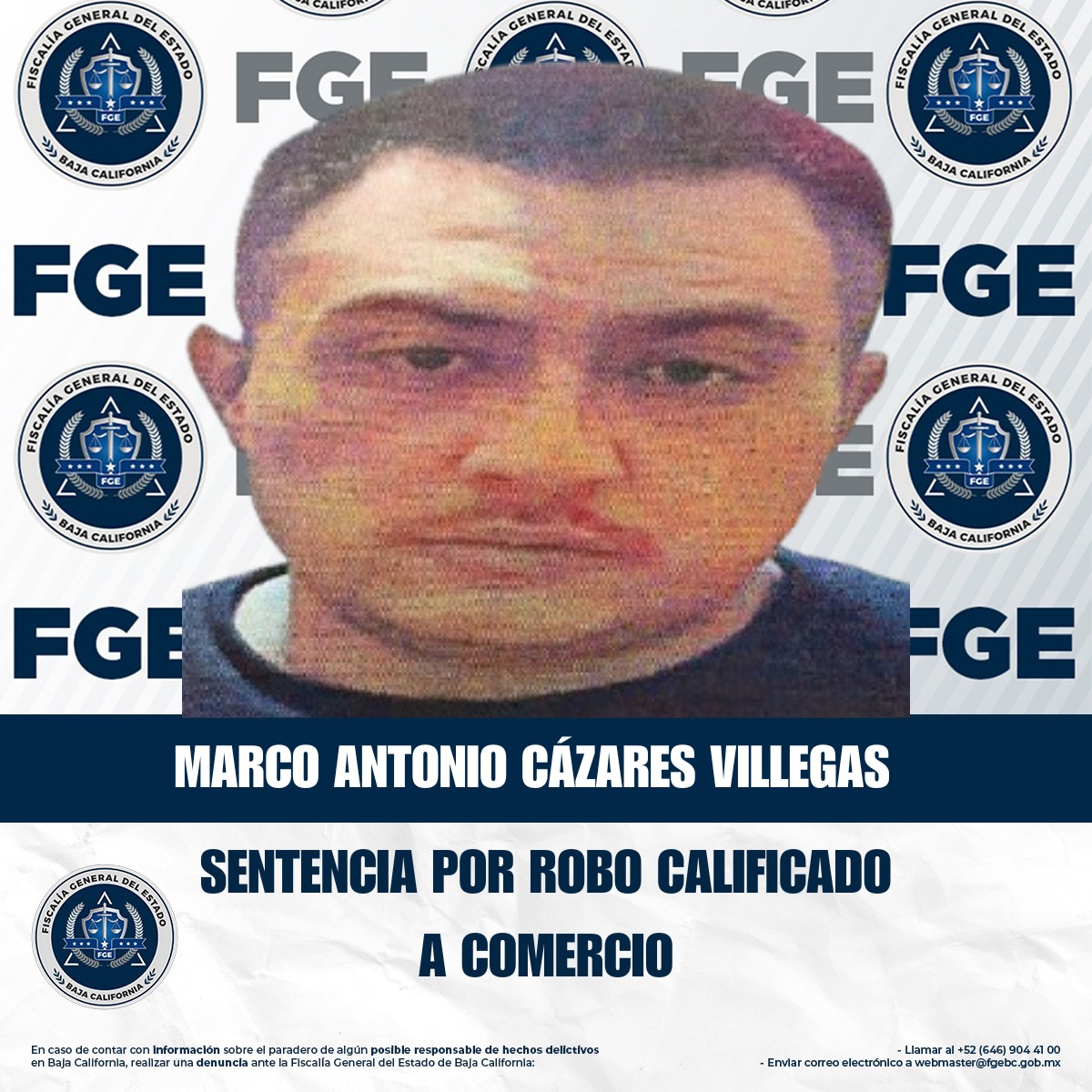 TIJUANA, BAJA CALIFORNIA. - La Fiscalía Regional de Tijuana, a través del trabajo realizado por la Unidad de Investigación de Robos Zona Centro, obtuvo una sentencia condenatoria en contra de Marco Antonio Cázarez Villegas, por el delito de robo calificado a establecimiento comercial abierto al público.