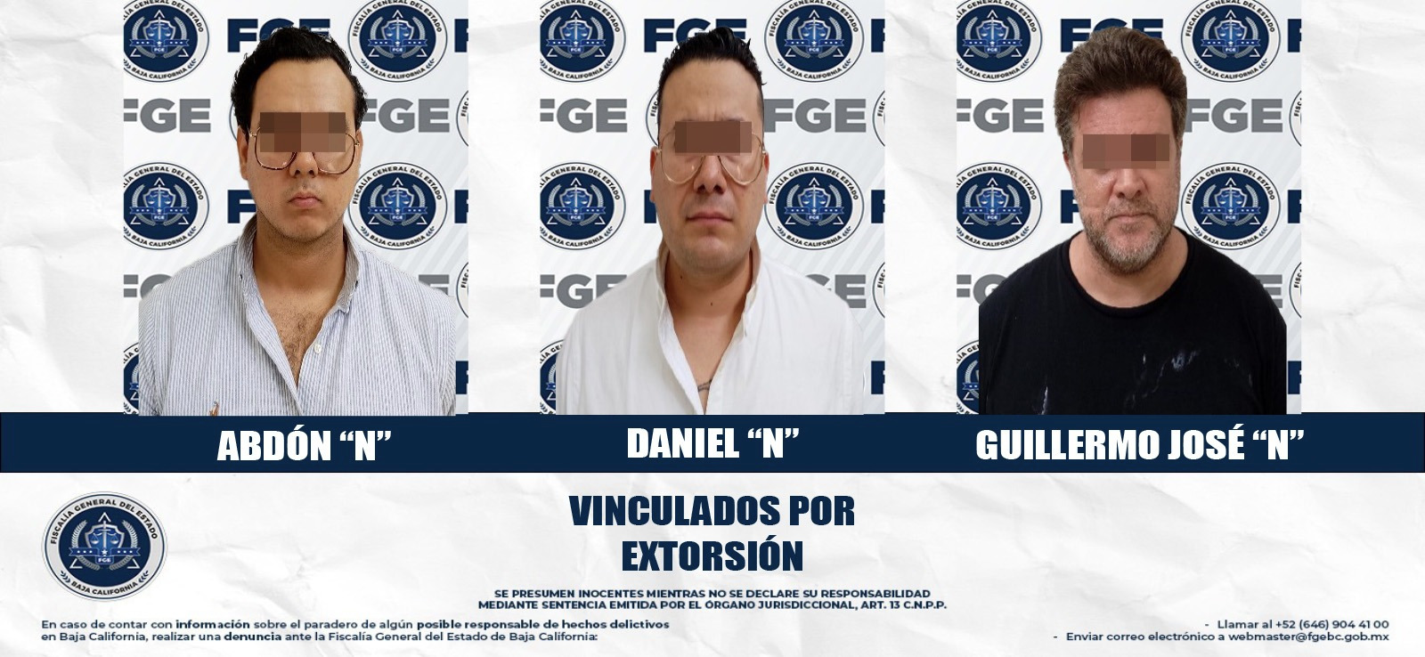 MEXICALI, BAJA CALIFORNIA. - La Fiscalía General del Estado, a través de la Fiscalía Regional de Mexicali, obtuvo la vinculación a proceso y la imposición de la medida cautelar de prisión preventiva contra Daniel “N”, Abdón “N” y Guillermo José “N”, por su presunta participación en el delito de extorsión.