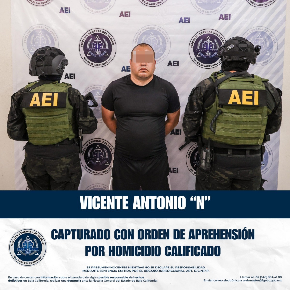 Una vez ubicado y detenido, Vicente Antonio “N” quedó a disposición del Juez de Control del Poder Judicial del Estado de Baja California que ordenó su aprehensión, para continuar con el proceso legal en su contra.