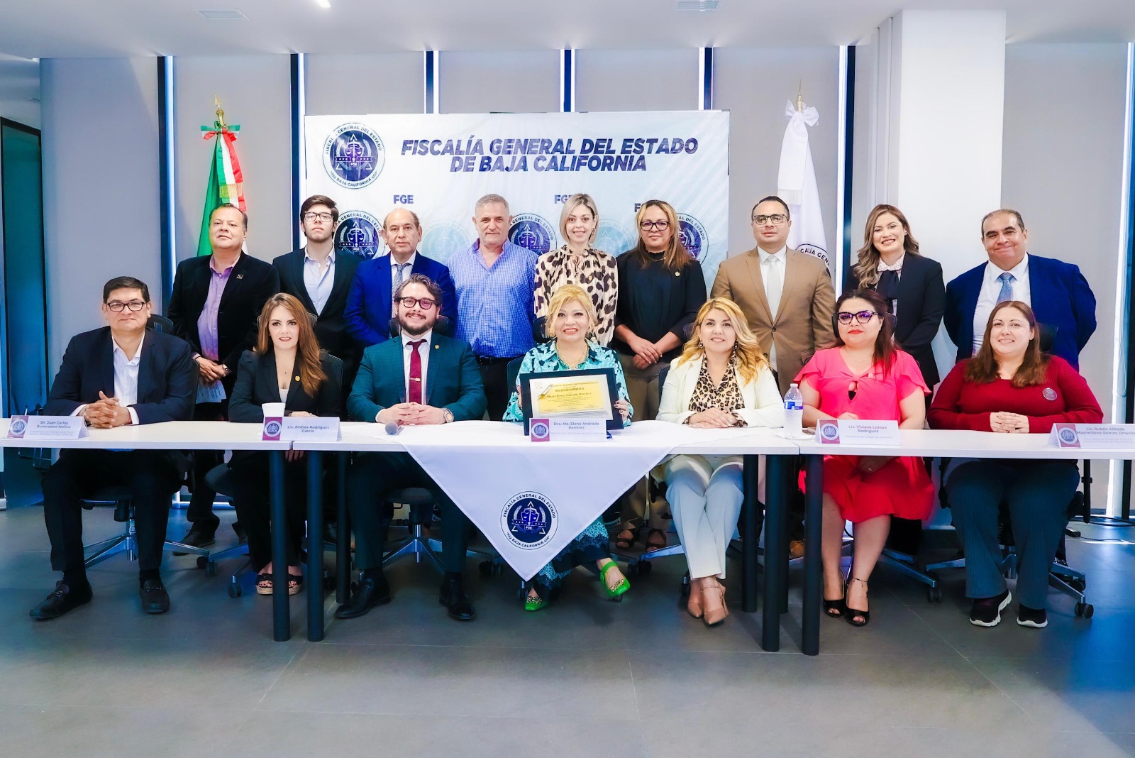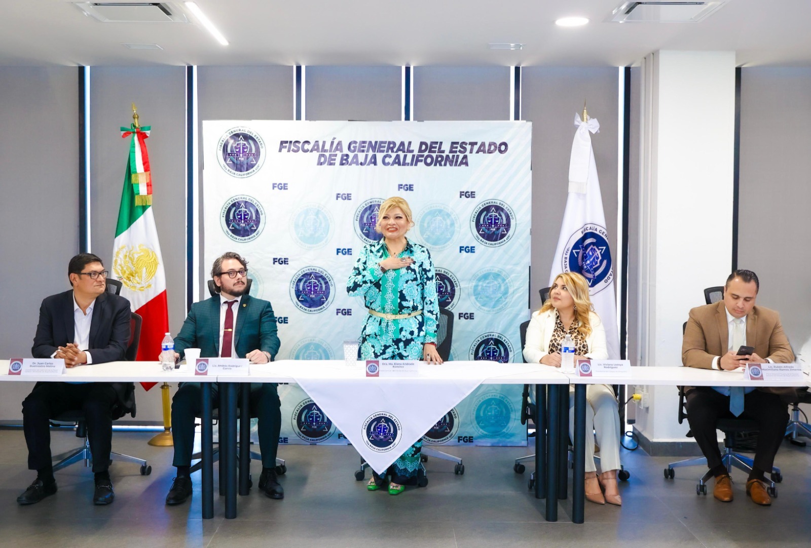 Acompañaron a la Fiscal General en esta reunión, Mtro. Juan Carlos Buenrostro Molina, Coordinador de Gabinete de la Fiscalía General del Estado; Lic. Rubén Alfredo Maximiliano Ramos Jiménez, Fiscal Regional de Tijuana; Lic. Viviana Lozoya Rodríguez, Presidenta del Colegio de Abogados Constitucionalistas; Lic. Andrés Rodríguez García, integrante del Colegio; Además de invitados especiales, quienes participaron activamente en el intercambio de ideas y propuestas.