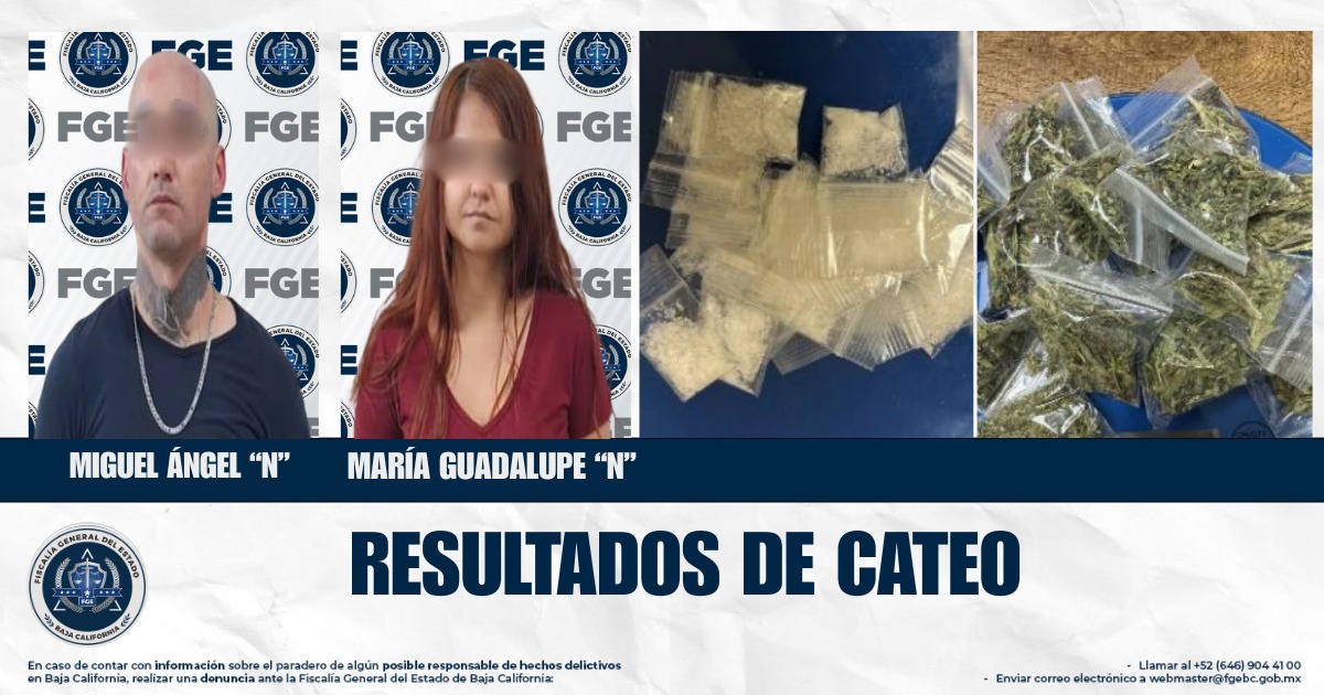 ENSENADA, BAJA CALIFORNIA. - La Fiscalía General del Estado, en cumplimiento de una orden de cateo, llevó a cabo una diligencia en un domicilio ubicado en el fraccionamiento San Borja, que derivó en la detención de dos personas y el aseguramiento de droga, así como del inmueble en cuestión.