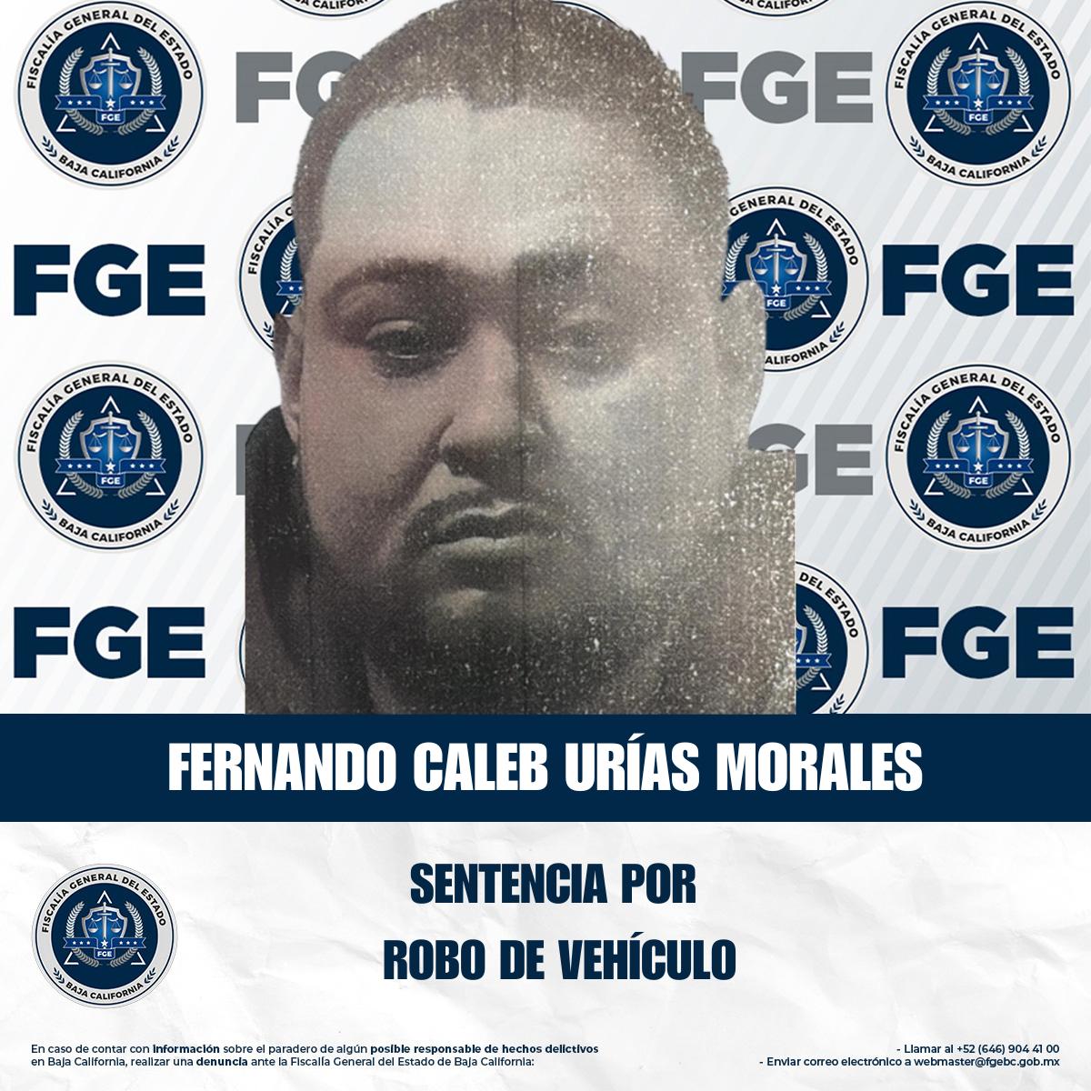 TIJUANA, BAJA CALIFORNIA. - La Fiscalía General del Estado, a través de la Unidad de Investigación Especializada en Robo de Vehículos de la Fiscalía Regional de Tijuana, obtuvo una sentencia condenatoria en contra de Fernando Caleb Urías Morales, por su responsabilidad en el delito de robo de vehículo de motor en grado de consumado, mediante la vía de procedimiento abreviado.