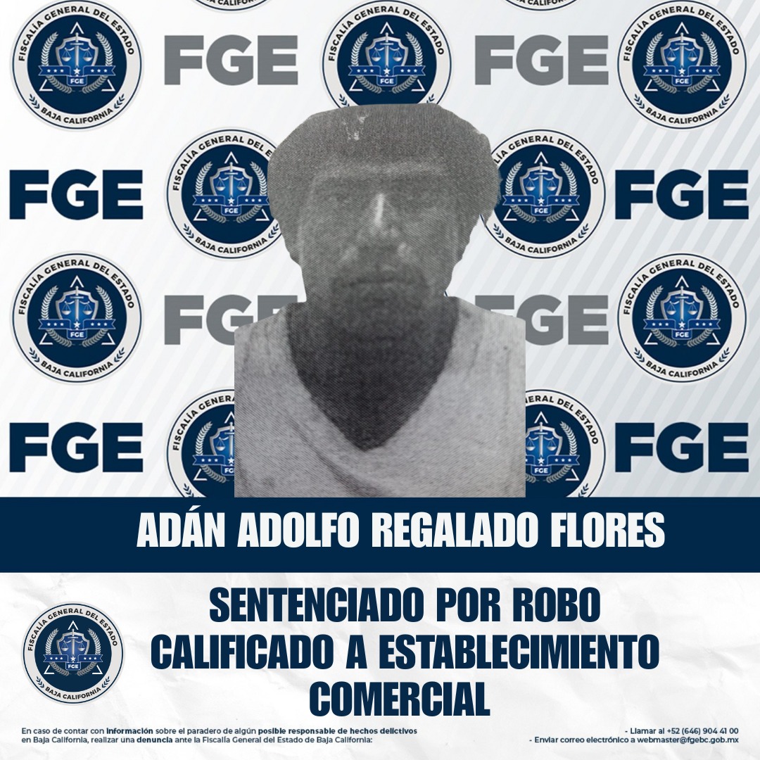 ENSENADA, BAJA CALIFORNIA. - La Fiscalía Regional de Ensenada, a través de la Unidad de Investigación de Robos, obtuvo sentencia condenatoria contra Adán Adolfo Regalado Flores, por el delito de robo cometido en un establecimiento comercial ubicado en la colonia Centro de esta ciudad.