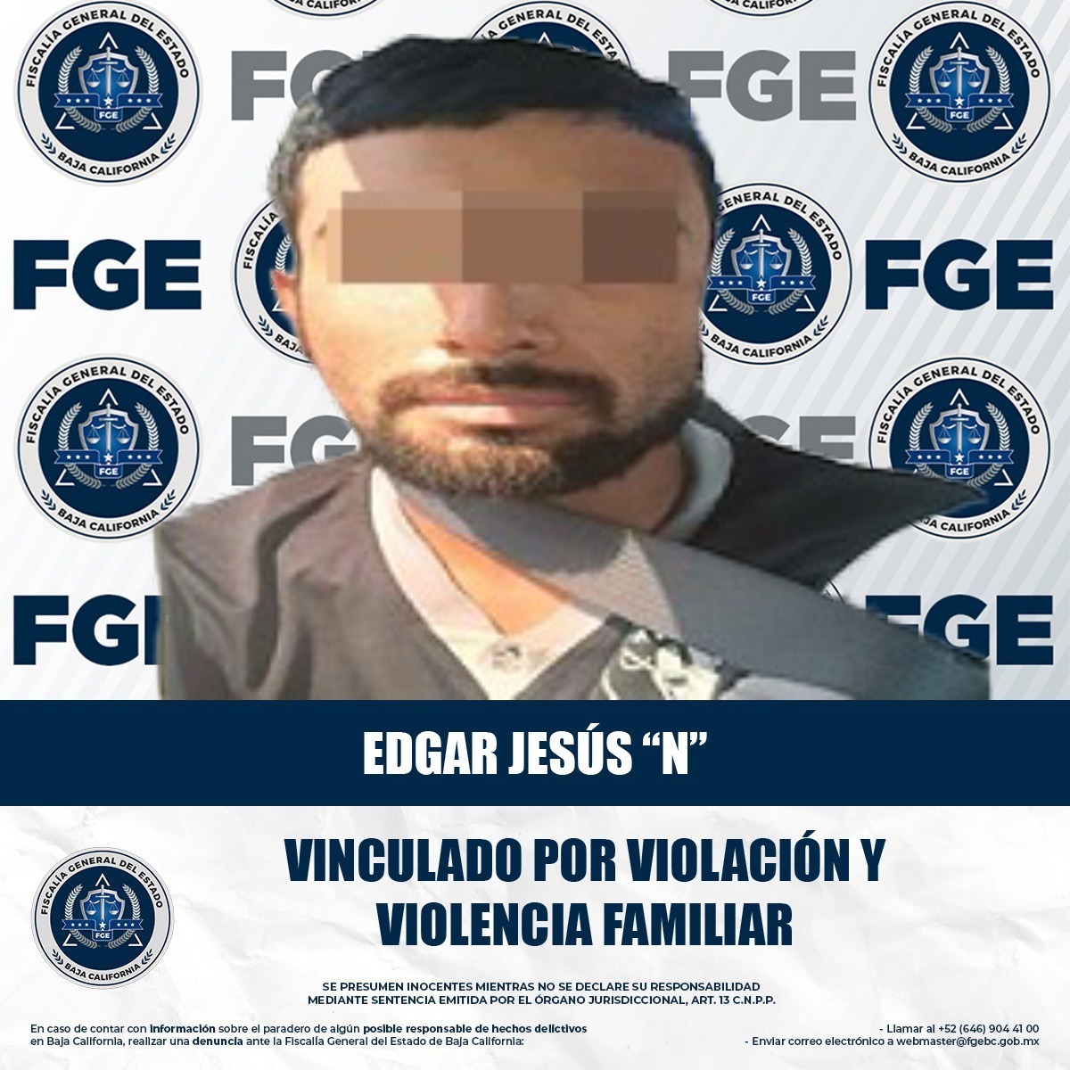 MEXICALI, BAJA CALIFORNIA. - La Fiscalía Regional de Mexicali, a través de la Unidad de Investigación de Delitos Foránea Ciudad Morelos, obtuvo la vinculación a proceso de Edgar Jesús “N”, por su presunta participación en los delitos de violación y violencia familiar.