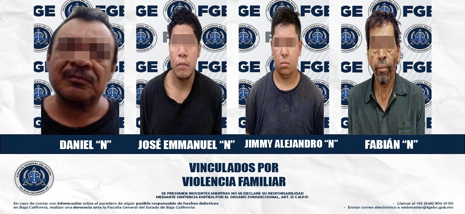 MEXICALI, BAJA CALIFORNIA. - La Fiscalía Regional de Mexicali, a través de las Unidades de Investigación con Detenidos Poniente y Foránea de Guadalupe Victoria, obtuvo la vinculación a proceso de cuatro individuos por el delito de violencia familiar, en audiencias celebradas de forma independiente.