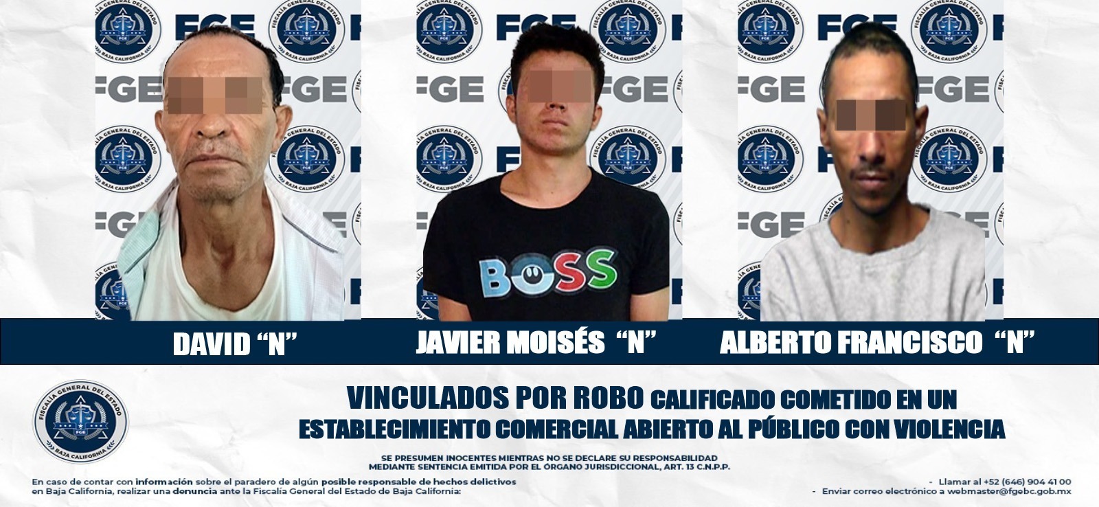 MEXICALI, BAJA CALIFORNIA. - La Fiscalía Regional de Mexicali, a través de la Unidad de Investigación de Delitos con Detenidos Oriente, obtuvo la vinculación a proceso de tres individuos, esto por su presunta participación en el delito de robo calificado cometido en establecimiento comercial abierto al público.
