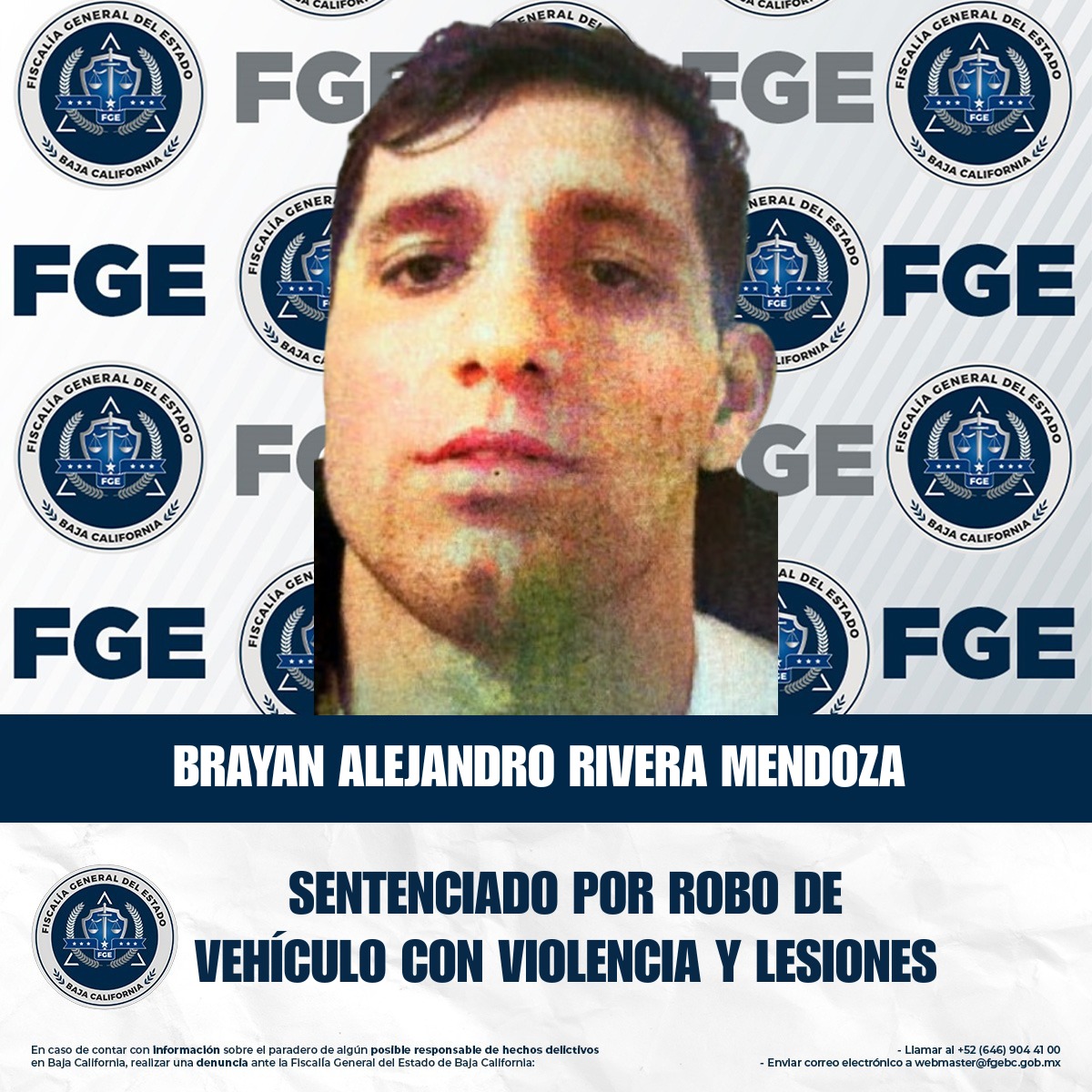 TIJUANA, BAJA CALIFORNIA. - La Fiscalía General del Estado, a través de la Fiscalía Regional de Tijuana y en coordinación con la Unidad de Investigación Especializada en Robo de Vehículos, logró una sentencia condenatoria en contra de Brayan Alejandro Rivera Mendoza, por su responsabilidad en los delitos de robo de vehículo con violencia en grado de tentativa y lesiones que ponen en peligro la vida.