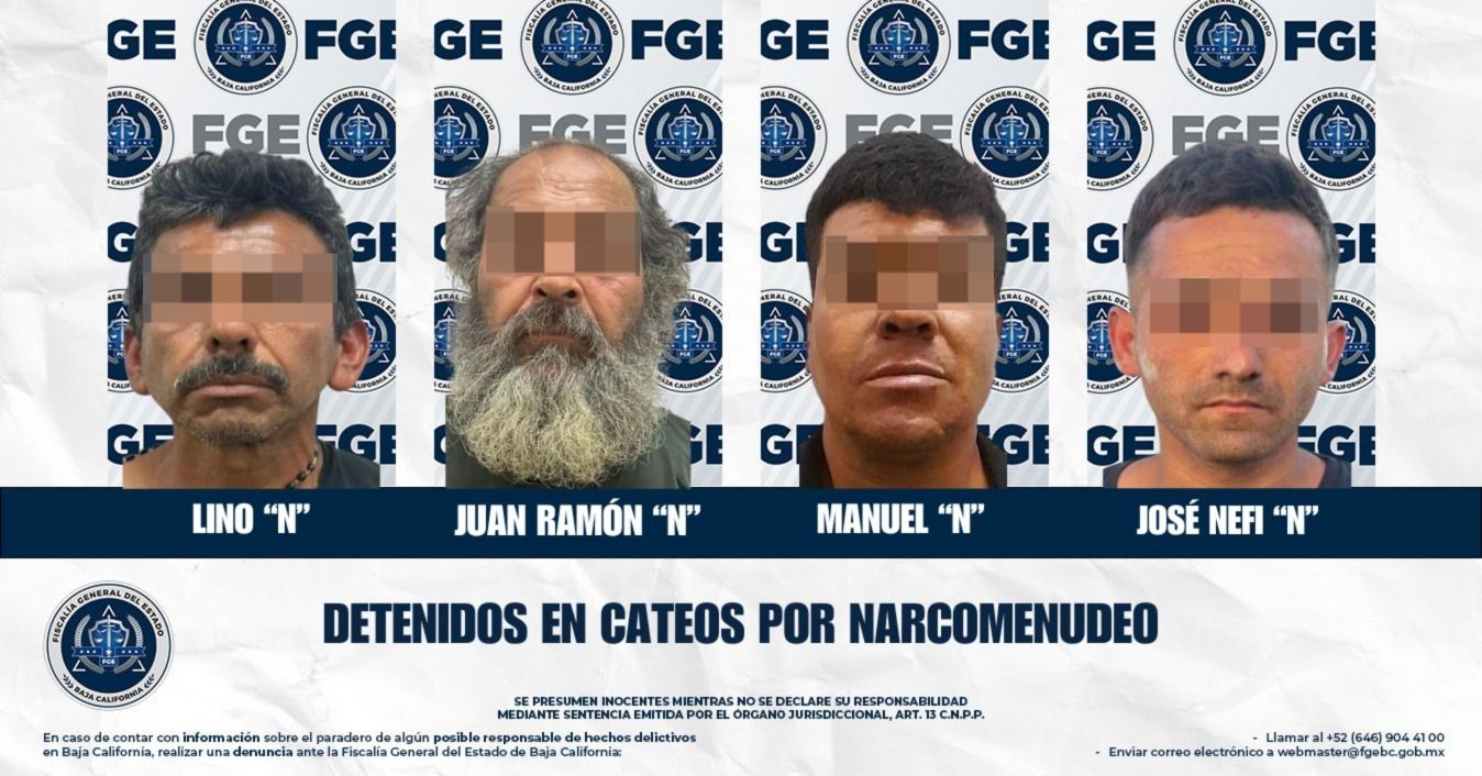 TIJUANA, BAJA CALIFORNIA. - En el marco de los operativos de cateo orientados al combate del narcomenudeo, la Fiscalía General del Estado obtuvo órdenes judiciales que derivaron en la detención de cuatro personas y el aseguramiento de diversas cantidades de droga.