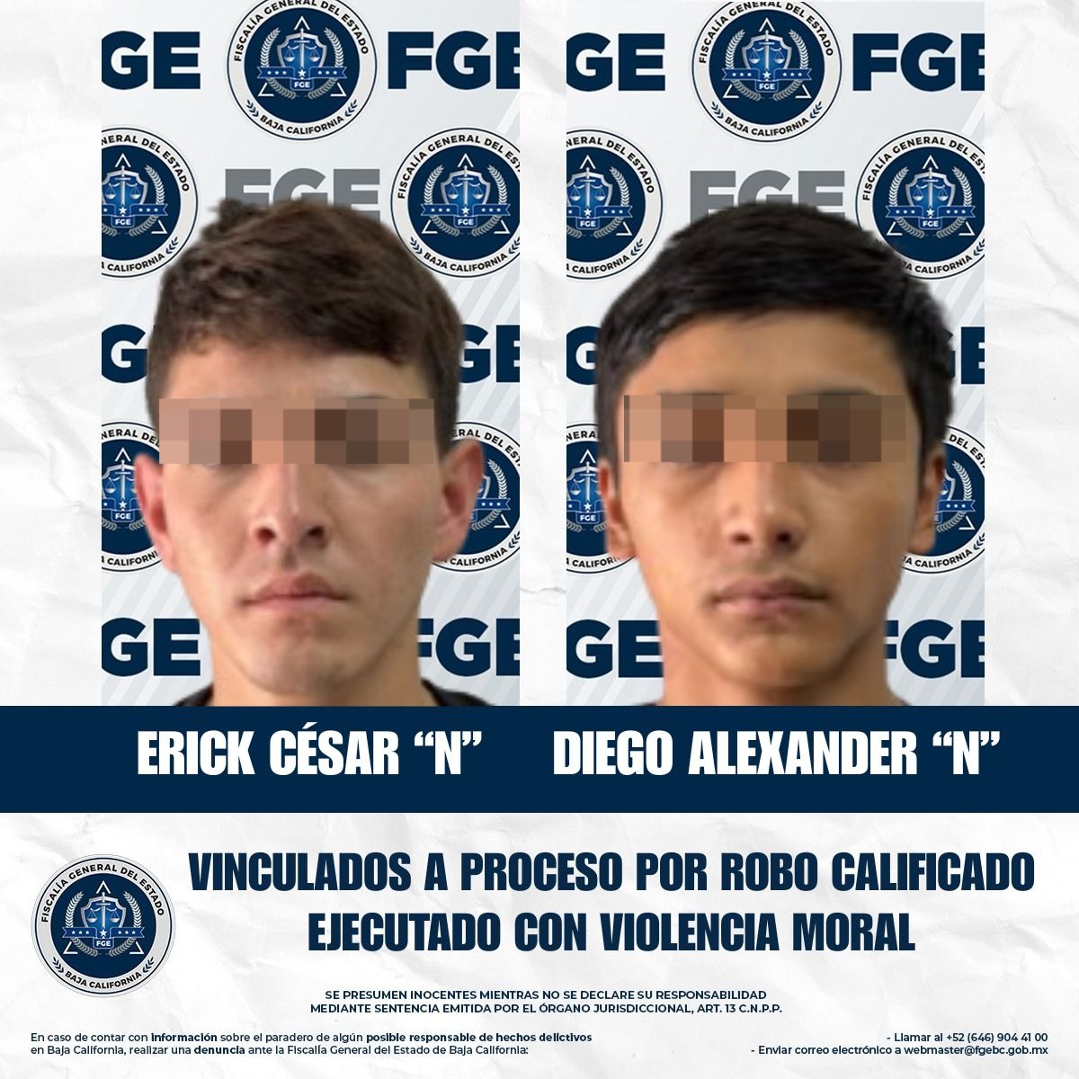ROSARITO, BAJA CALIFORNIA. - Con base a la presentación de pruebas sólidas, la Unidad de Investigación Especializada en Robos, adscrita a la Fiscalía Regional de Playas de Rosarito, en coordinación con Unidades Especializadas, logró la vinculación a proceso de Erick César “N” y Diego Alexander “N”, por el delito de robo calificado cometido por dos o más personas ejecutado con violencia moral.
