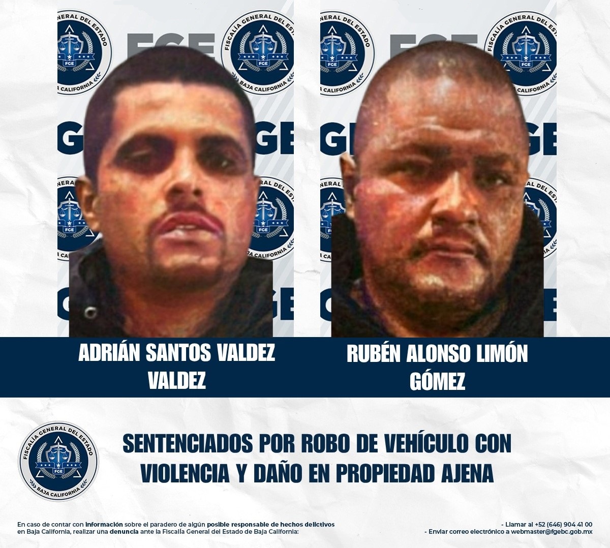 TIJUANA, BAJA CALIFORNIA. - La Fiscalía General del Estado, a través de la Fiscalía Regional de Tijuana y en coordinación con la Unidad de Investigación de Robo de Vehículos Zona Tijuana, logró obtener sentencia condenatoria en contra de Adrián Santos Valdez Valdez, alias “Duban” o “Adriel Santos Valdez”, y Rubén Alonso Limón Gómez, por los delitos de robo de vehículo con violencia y daño en propiedad ajena por culpa.