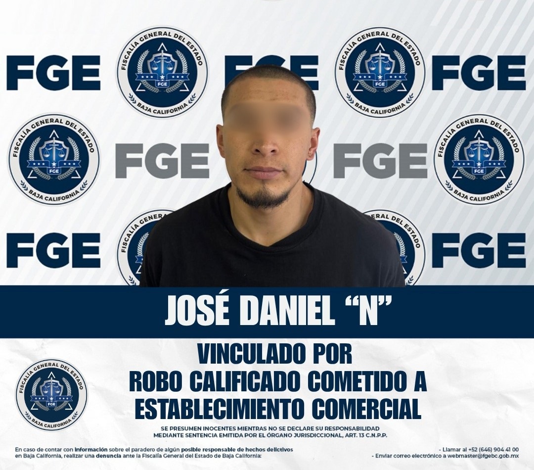 ENSENADA, BAJA CALIFORNIA. - La Fiscalía Regional de Ensenada, a través de la Unidad de Investigación de Robos, obtuvo la vinculación a proceso en contra de José Daniel “N”, por su probable participación en el delito de robo calificado cometido en establecimiento comercial abierto al público, en hechos ocurridos el pasado 19 de abril de 2025.