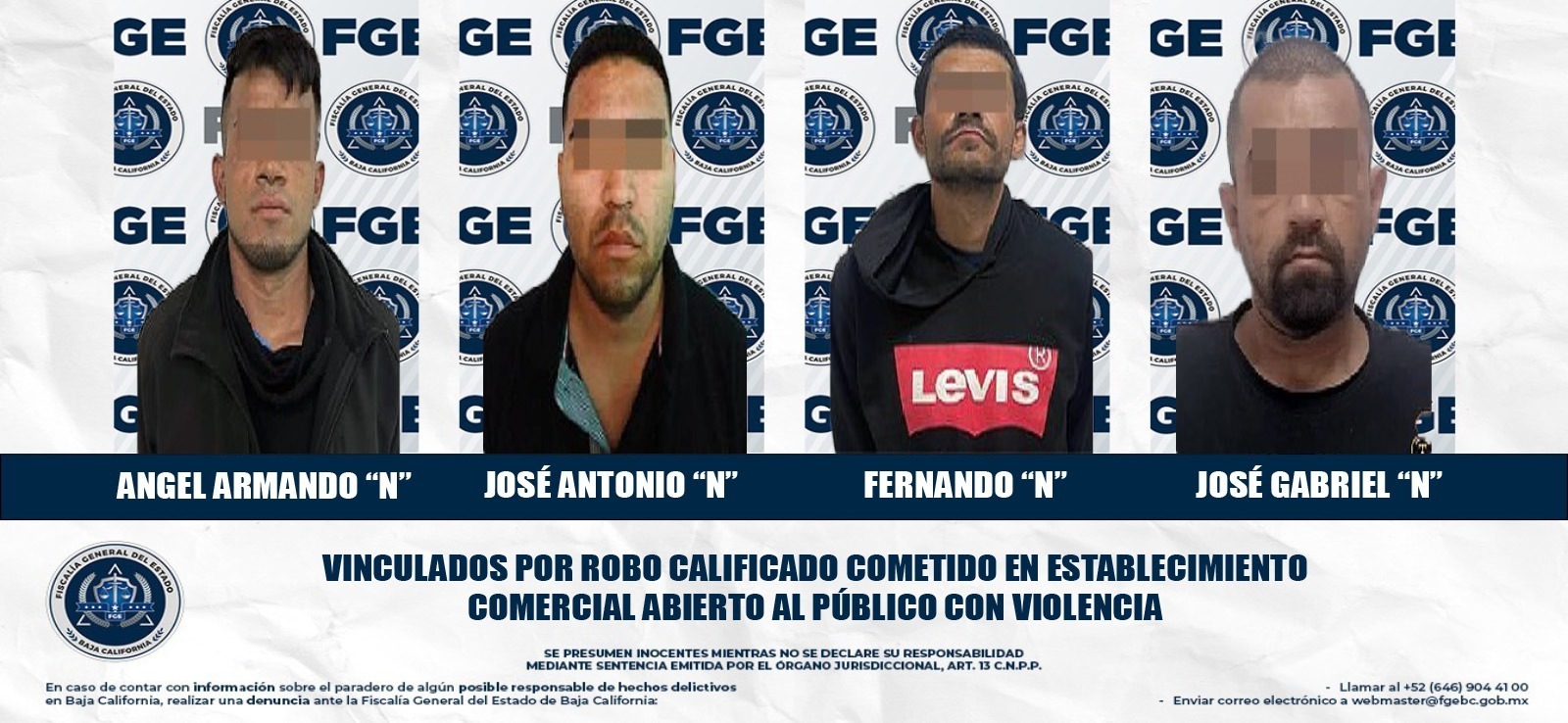 MEXICALI, BAJA CALIFORNIA. - La Fiscalía Regional de Mexicali, a través de la Unidad de Investigación de Delitos de Robo Oriente, y de Poniente, obtuvo la vinculación a proceso de cuatro individuos, por su presunta participación en el delito de robo calificado cometido en establecimiento comercial abierto al público con violencia.