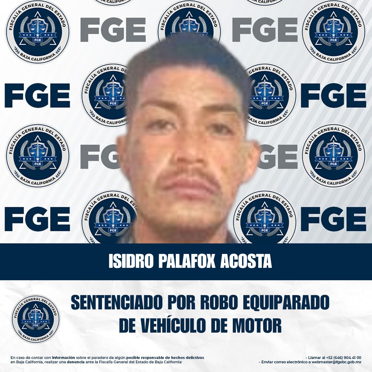 TIJUANA, BAJA CALIFORNIA. - La Fiscalía Regional de Tijuana, a través de la Unidad de Investigación Especializada en Robo de Vehículos, logró una sentencia condenatoria en contra de Isidro Palafox Acosta, alias “Harold Palafox Acosta”, por el delito de robo equiparado de vehículo de motor, en la modalidad de poseer un vehículo robado.