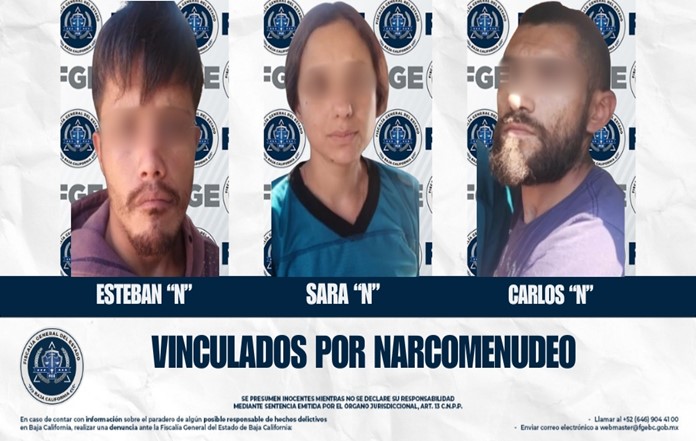 ENSENADA, BAJA CALIFORNIA. - La Fiscalía Especializada en Narcomenudeo, en coordinación con elementos de la Policía Municipal, consiguió la vinculación a proceso de tres personas por delitos contra la salud en su modalidad de narcomenudeo.
