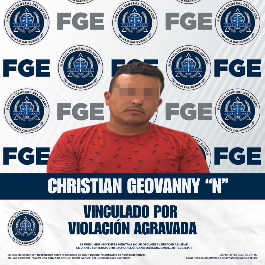 ENSENADA, BAJA CALIFORNIA. - La Fiscalía Regional de Ensenada informa que, a través de la Unidad de Investigación en Maneadero, se ha obtenido auto de vinculación a proceso en contra de Christian Geovanny “N”, por su presunta responsabilidad en el delito de violación agravada por razón de parentesco, en agravio de una menor de edad.