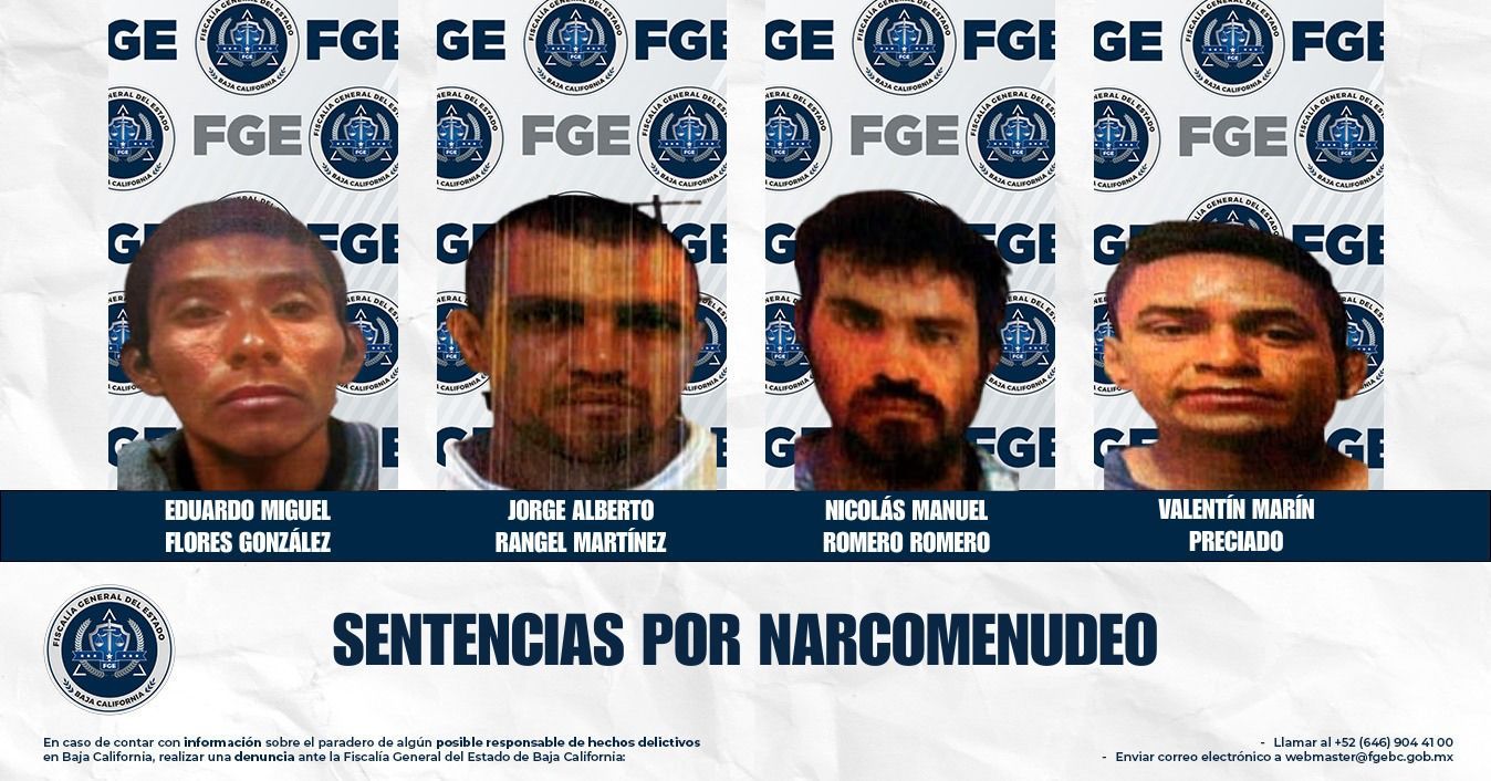 PLAYAS DE ROSARITO, BAJA CALIFORNIA. - En cuatro diferentes asuntos, igual número de imputados recibieron sentencia por su responsabilidad en delitos contra la salud, de acuerdo con la Fiscalía Especializada en Narcomenudeo se informó que, a través de procedimientos abreviados, los imputados recibieron sentencias de diez meses de prisión, de acuerdo con los criterios de los jueces, apegados a derecho.