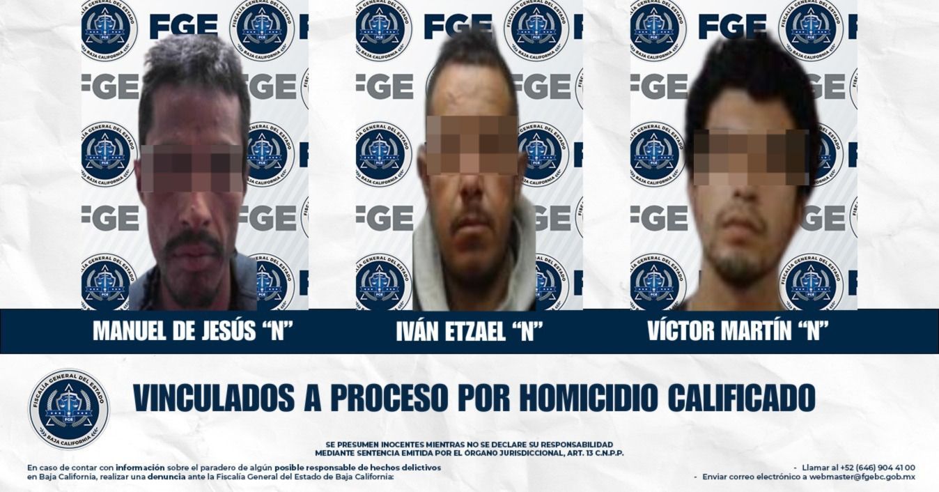 TIJUANA, BAJA CALIFORNIA. - La Fiscalía General del Estado informó que, por su presunta participación en el delito de homicidio calificado con ventaja, Manuel de Jesús “N”, Iván Etzael “N” y Víctor Martín “N” fueron vinculados a proceso penal.