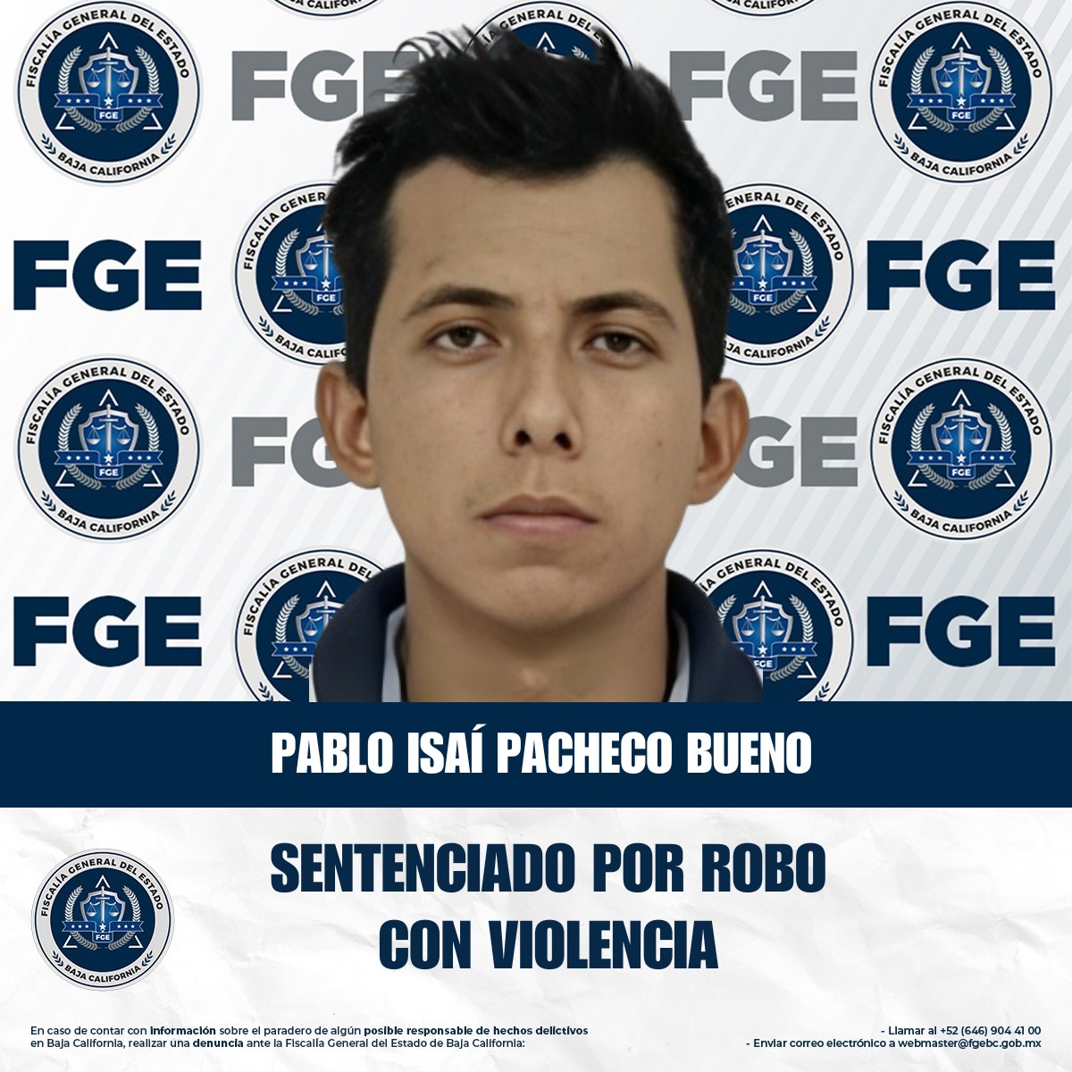 TECATE, BAJA CALIFORNIA. - La Fiscalía Regional de Tecate, a través de las labores de la Unidad de Investigación de Delitos con Detenido, logró obtener una sentencia condenatoria en contra de Pablo Isaí Pacheco Bueno por el delito de robo con violencia.