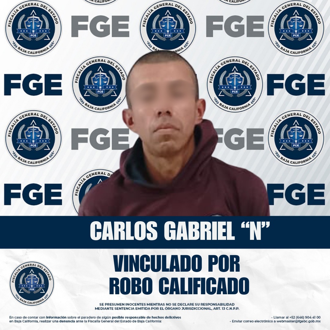 ENSENADA, BAJA CALIFORNIA. - La Fiscalía Regional de Ensenada, a través de la Unidad de Investigación de Delitos con Detenido, logró que un juez de control dictara auto de vinculación a proceso en contra de Carlos Gabriel “N”, por el delito de robo calificado, cometido en perjuicio de una institución educativa de nivel básico en esta ciudad.