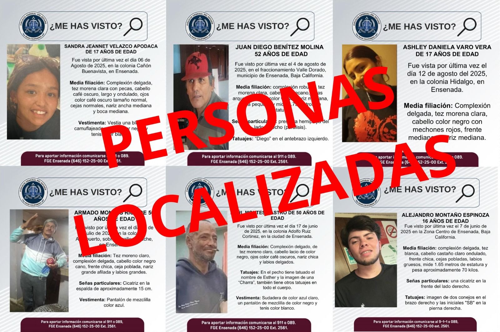ENSENADA, BAJA CALIFORNIA. - La Fiscalía General del Estado, a través de la Unidad Especializada para la Investigación y Persecución de Delitos de Desaparición Forzada y Desaparición Cometida por Particulares, informa la localización de seis personas que contaban con reporte de desaparición.