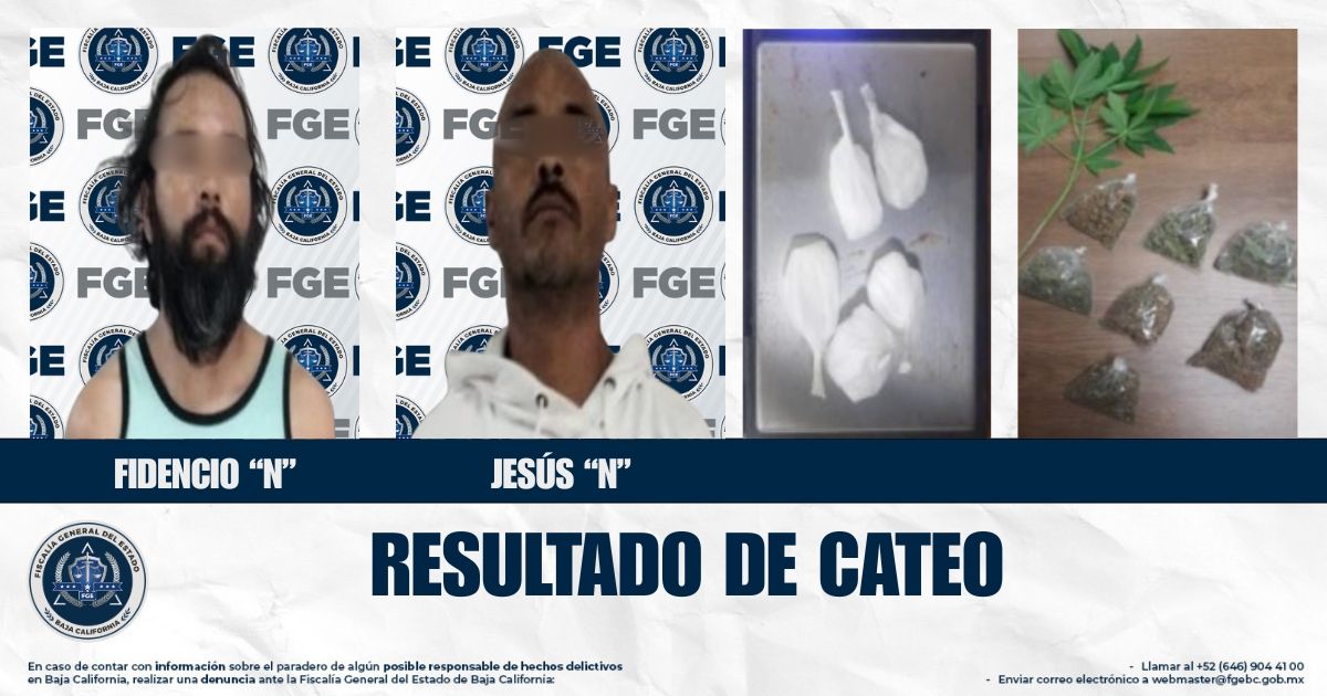 ENSENADA, BAJA CALIFORNIA. - La Fiscalía Especializada en Narcomenudeo, en coordinación con el Ministerio Público y elementos de la Agencia Estatal de Investigación (AEI), realizó un cateo en la colonia Margaritas que permitió la detención de dos hombres y el aseguramiento de narcóticos e inmueble.