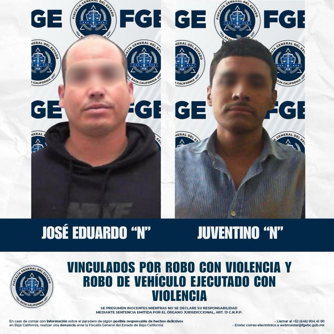 ENSENADA, BAJA CALIFORNIA. - La Fiscalía Regional de Ensenada obtuvo la vinculación a proceso de José Eduardo “N” y Juventino “N”, presuntos responsables de participar en el robo con violencia de un vehículo, ocurrido en enero de 2022. Como medida cautelar, el Juez de Control impuso la prisión preventiva oficiosa, mientras se desarrolla la investigación complementaria, la cual concluirá el próximo 21 de octubre de 2025.