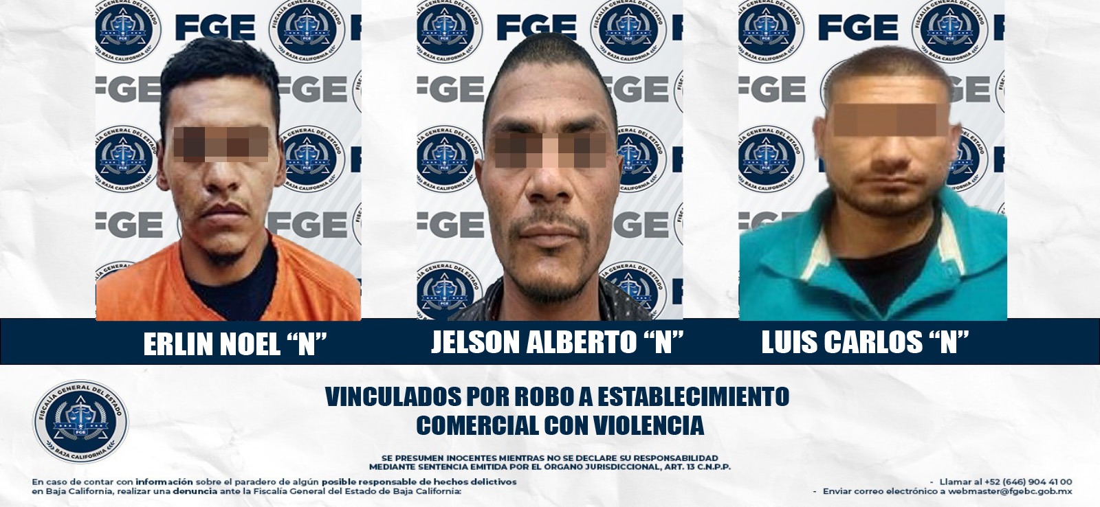 MEXICALI, BAJA CALIFORNIA. - Con base en el trabajo realizado por la Fiscalía Regional de Mexicali, a través de la Unidad de Investigación de Delitos de Robo Poniente, se obtuvo la vinculación a proceso de tres hombres por su presunta participación en robos violentos registrados en establecimientos comerciales Oxxo.