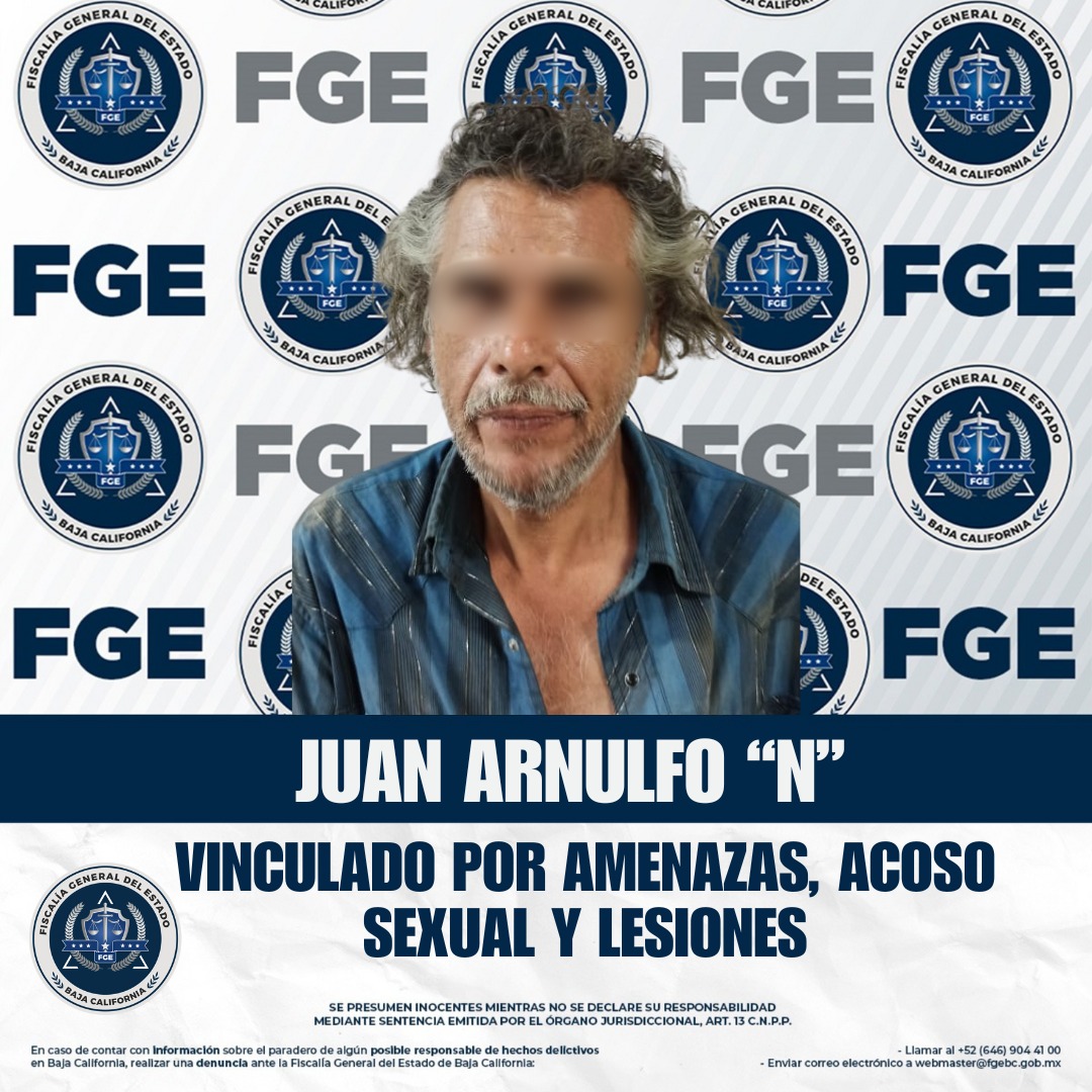 ENSENADA, BAJA, CALIFORNIA - La Fiscalía Regional de Ensenada obtuvo la vinculación a proceso de Juan Arnulfo “N”, por su presunta responsabilidad en los delitos de amenazas, acoso sexual y lesiones, en agravio de una mujer y su pareja.