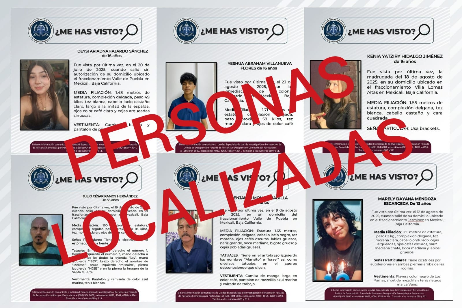 MEXICALI, BAJA CALIFORNIA. - La Fiscalía General del Estado de Baja California, a través de la Unidad Especializada para la Investigación y Persecución de Delitos de Desaparición Forzada y Desaparición Cometida por Particulares, informa la localización de seis personas que contaban con reporte de búsqueda.
