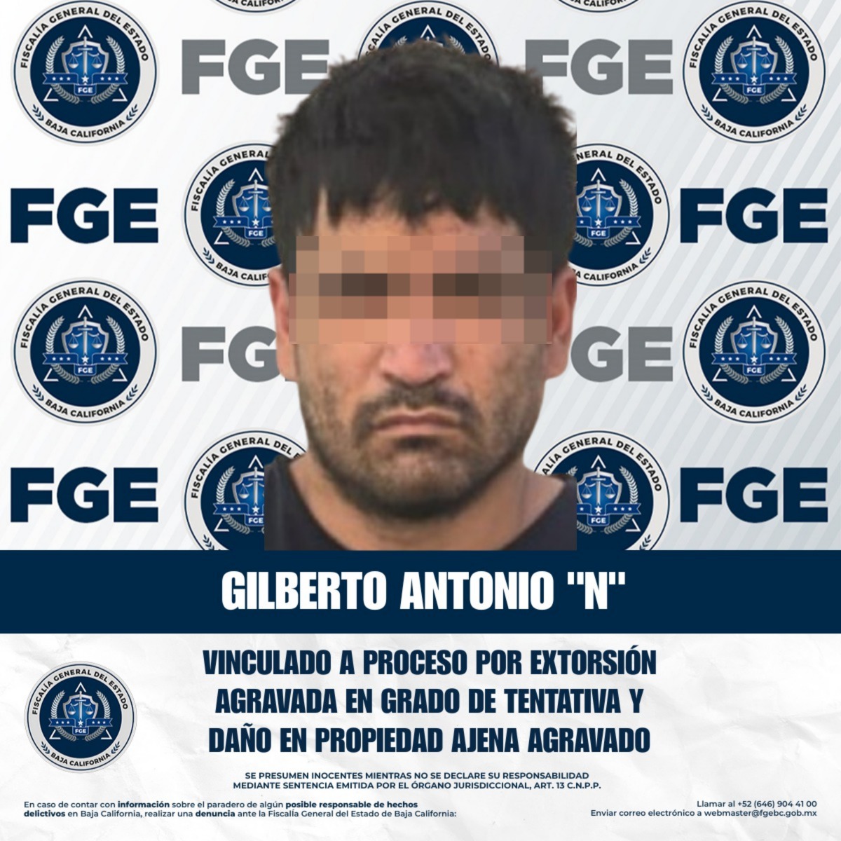 PLAYAS DE ROSARITO, BAJA CALIFORNIA. - La Fiscalía Regional de Playas de Rosarito, a través de la Coordinación de la Unidad de Investigación Especializada en Delitos Patrimoniales, informa que se logró obtener prisión preventiva justificada en contra de Gilberto Antonio “N”, por su probable responsabilidad en los delitos de extorsión agravada en grado de tentativa y daño en propiedad ajena agravado.
