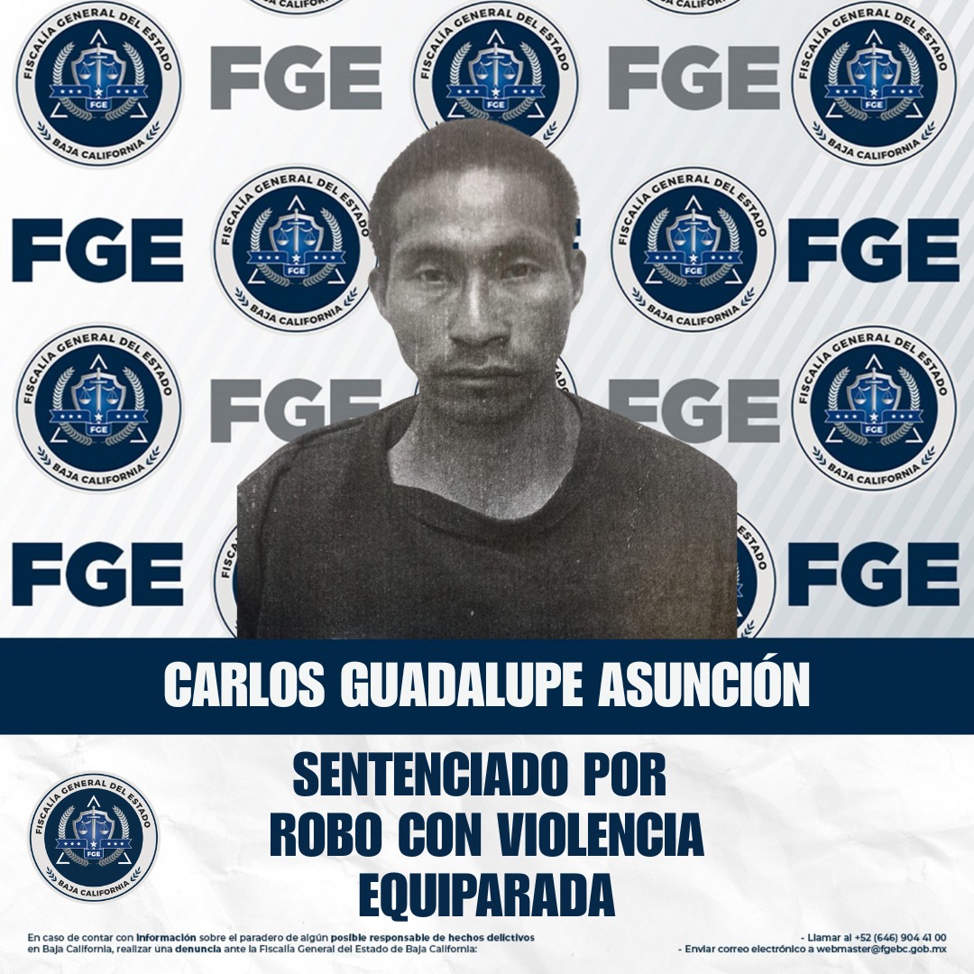 ENSENADA, BAJA CALIFORNIA. - La Fiscalía Regional de Ensenada, a través de la Unidad de Investigación con sede en Maneadero, obtuvo una sentencia condenatoria en contra de Carlos Guadalupe Asunción, por su responsabilidad en el delito de robo con violencia equiparada, cometido en mayo de 2024.