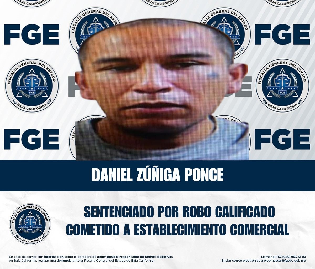 TECATE, BAJA CALIFORNIA. - La Unidad de Investigación contra Robos, adscrita a la Fiscalía Regional de Tecate logró sentencia condenatoria en contra de Daniel Zúñiga Ponce, alias “El Oculto”, por el delito de robo calificado cometido a establecimiento comercial abierto al público por persona armada.