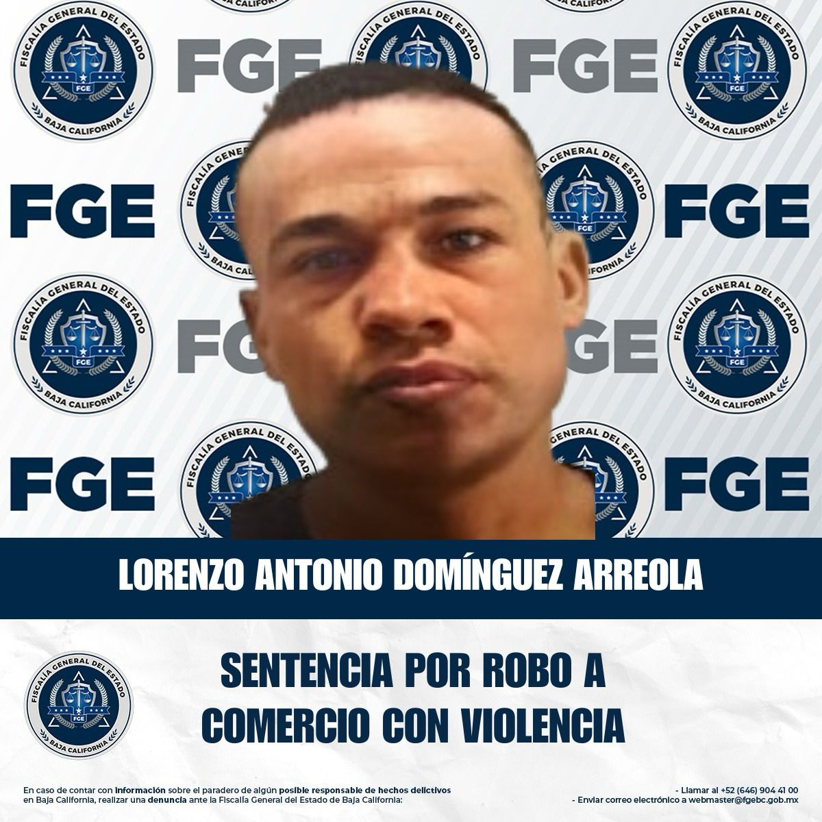 TIJUANA, BAJA CALIFORNIA. - La Fiscalía Regional de Tijuana, a través de la Unidad de Investigación de Robos de la zona Mariano Matamoros, obtuvo sentencia condenatoria en contra de Lorenzo Antonio Domínguez Arreola, por el delito de robo calificado a comercio ejecutado con violencia.