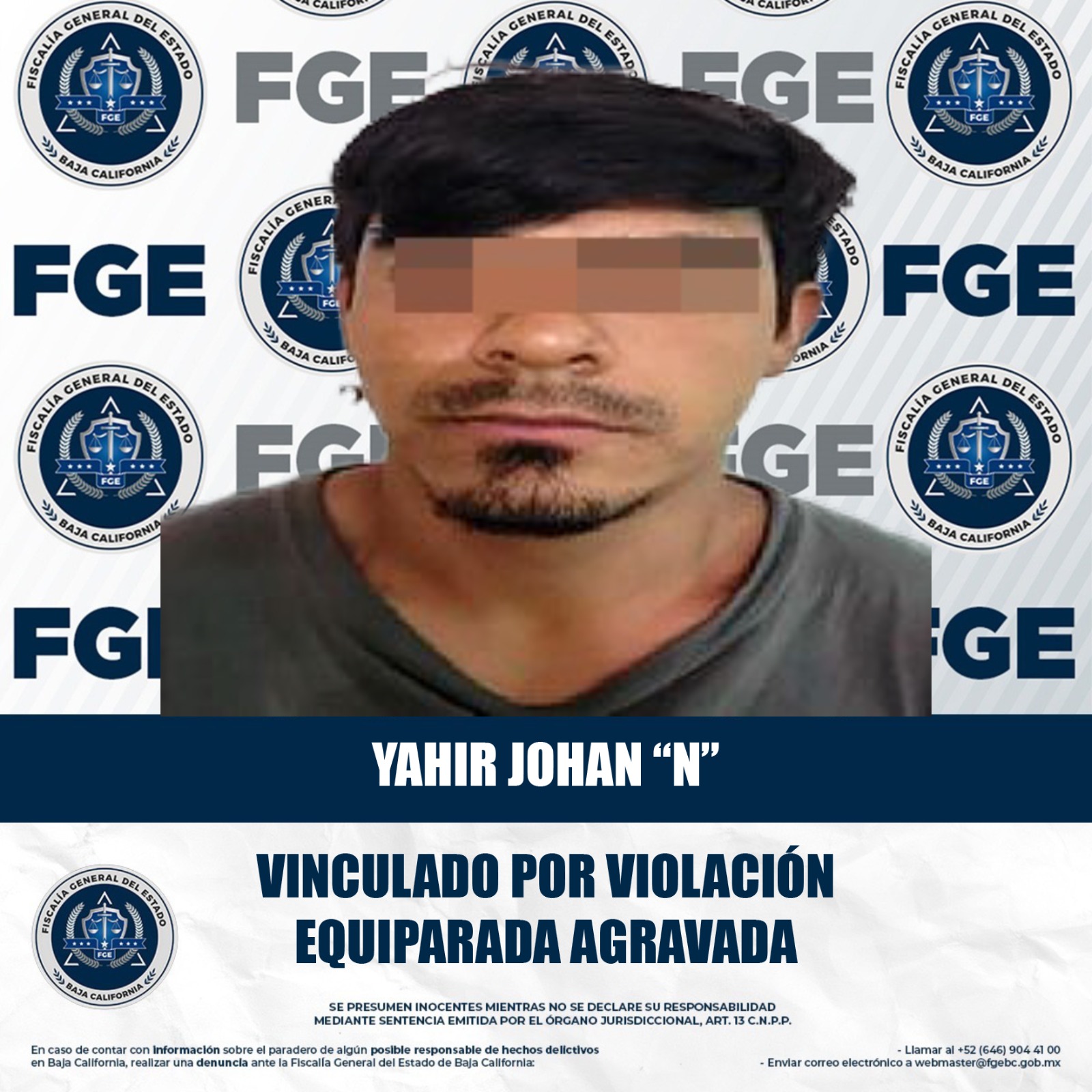 MEXICALI, BAJA CALIFORNIA. - La Fiscalía Regional de Mexicali, a través de la Unidad de Investigación con Detenidos Oriente, logró la vinculación a proceso de un hombre acusado del delito de violación agravada.