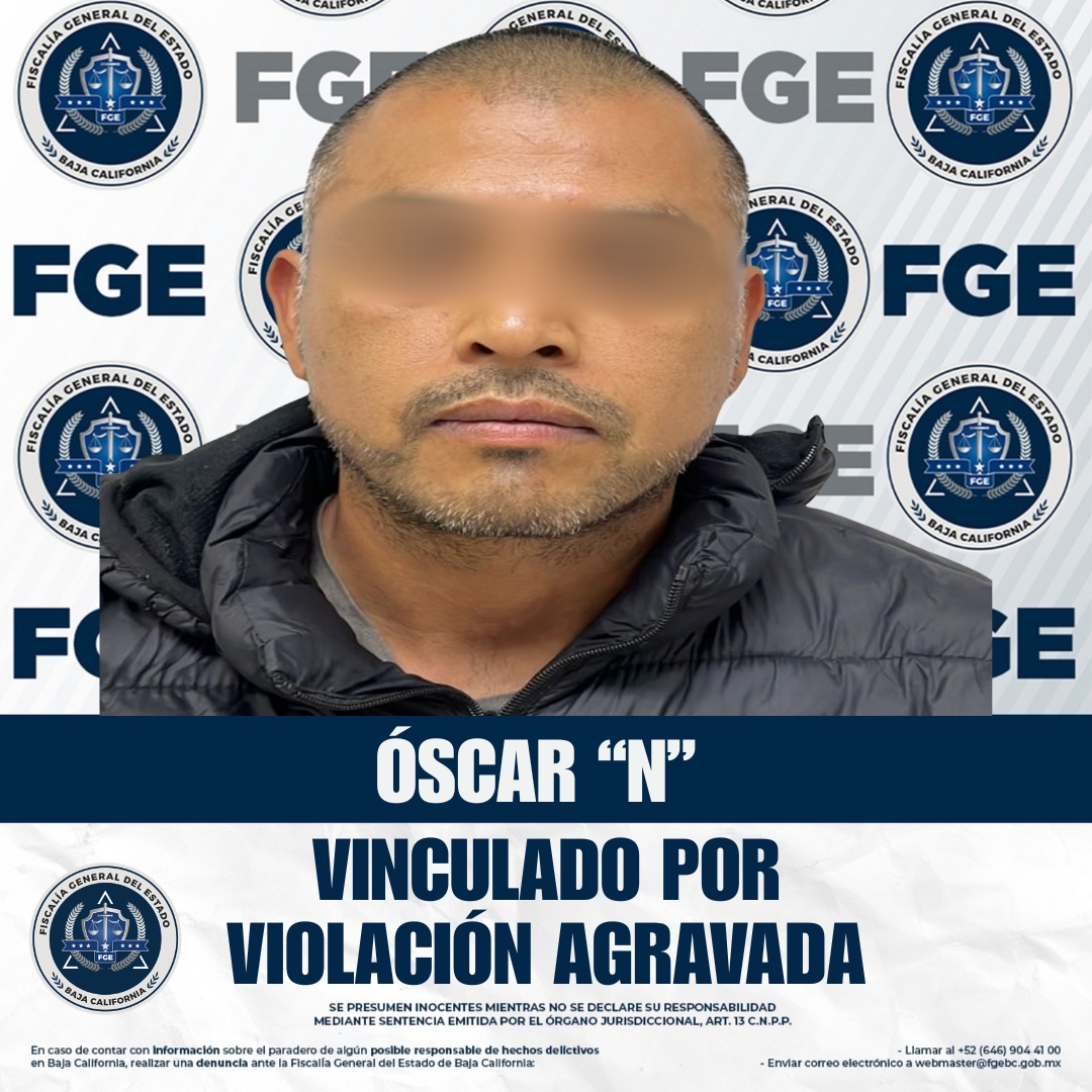 SAN QUINTÍN, BAJA CALIFORNIA. - La Fiscalía General del Estado (FGE), a través de la Fiscalía Especializada en Delitos Contra Mujeres por Razón de Género, en coordinación con la Unidad de Investigación de San Quintín, logró la vinculación en contra de Óscar “N”, por el delito de violación agravada.