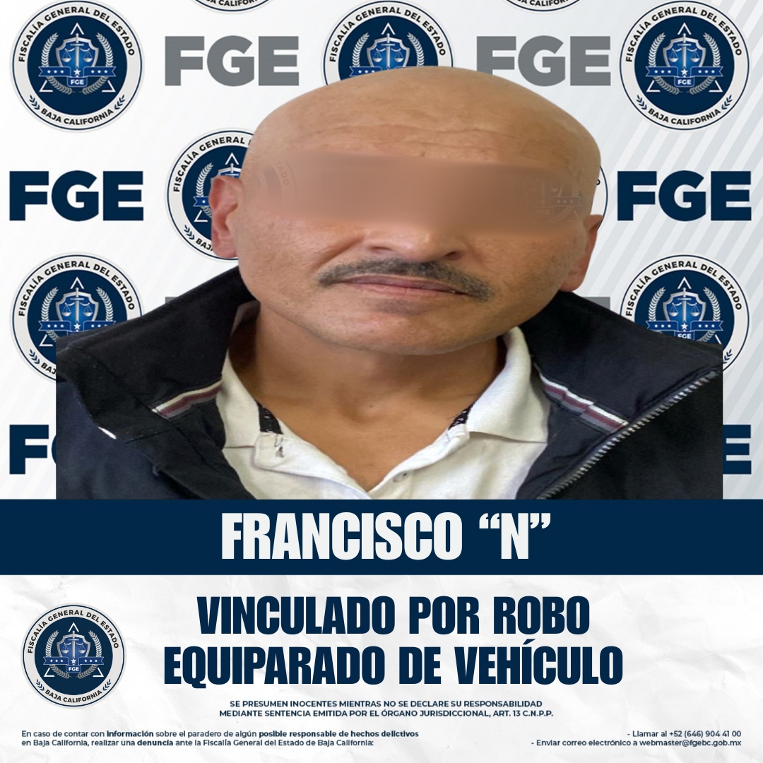 ENSENADA, BAJA CALIFORNIA. - La Fiscalía Regional de Ensenada, en coordinación con la Unidad de Robo de Vehículos, logró la vinculación de Francisco “N”, acusado por el delito de robo equiparado de vehículo de motor, en su modalidad de uso.