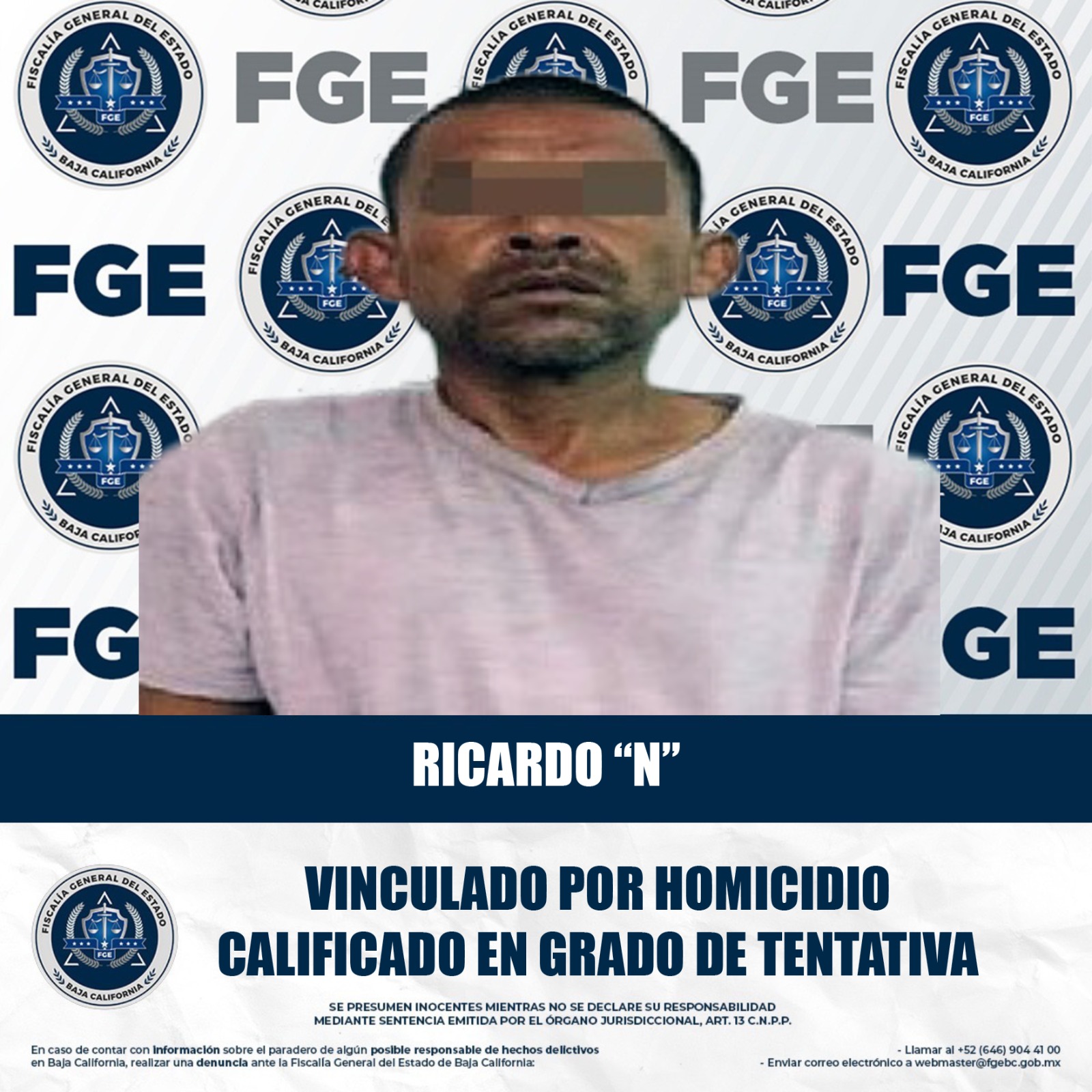 MEXICALI, BAJA CALIFORNIA. - La Fiscalía Regional de Mexicali, a través de la Unidad de Investigación con Detenidos Oriente, obtuvo la vinculación a proceso y la medida cautelar de prisión preventiva en contra de Ricardo “N”, acusado de homicidio calificado en grado de tentativa.